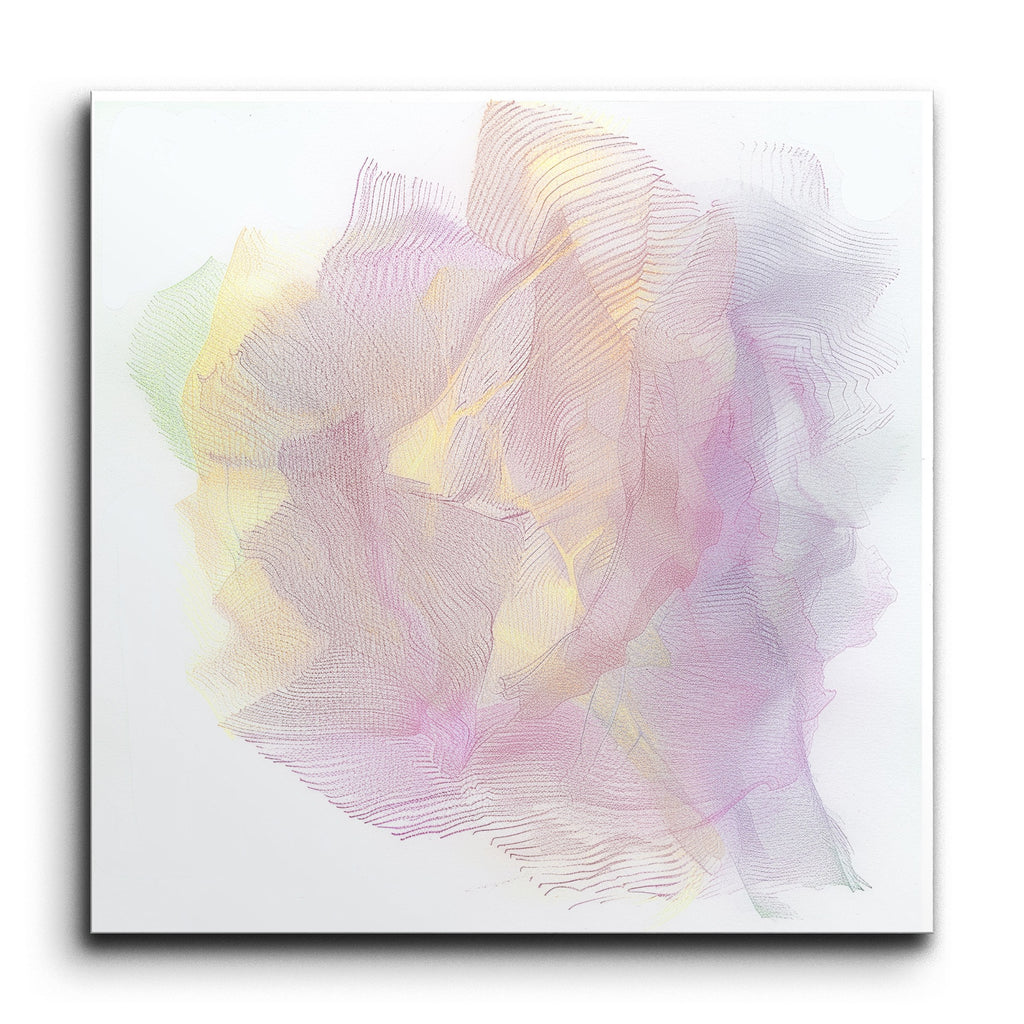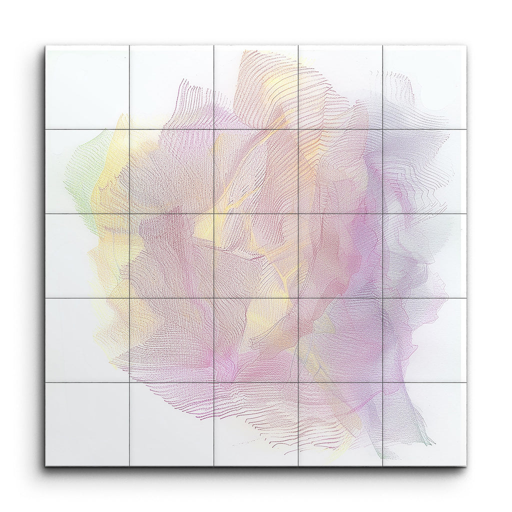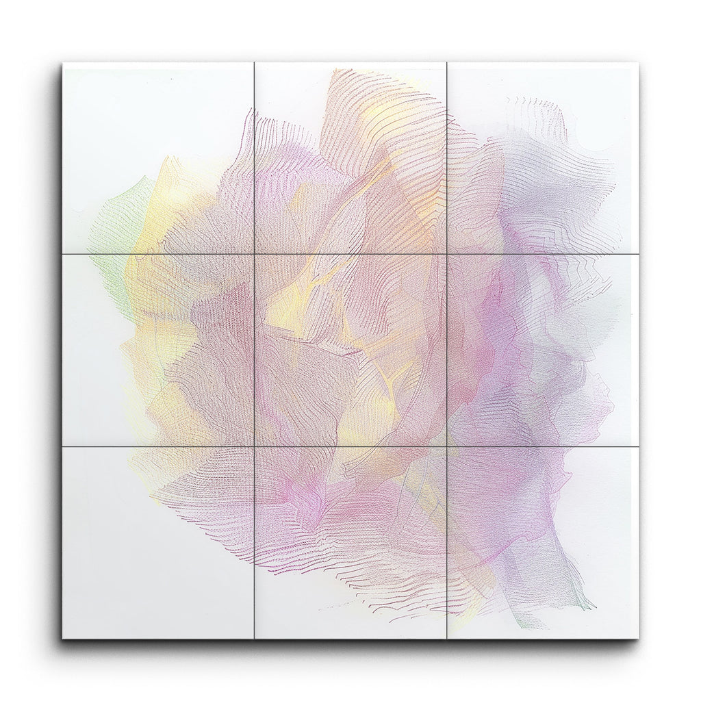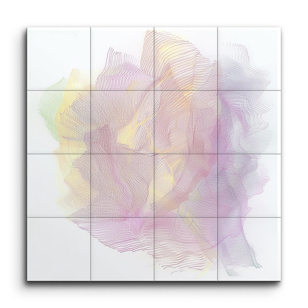 Transform your space with this enchanting tile mural, featuring an ethereal composition of fine, wavy lines that intertwine to form a cloud-like, abstract shape. The soft pastel palette, with shades of pink, purple, yellow, and hints of green, creates a dreamlike atmosphere. Varying line densities add depth and dimension, evoking a sense of calm and tranquility. This intricate and harmonious artwork is perfect for adding a touch of lightness and serenity to any room.