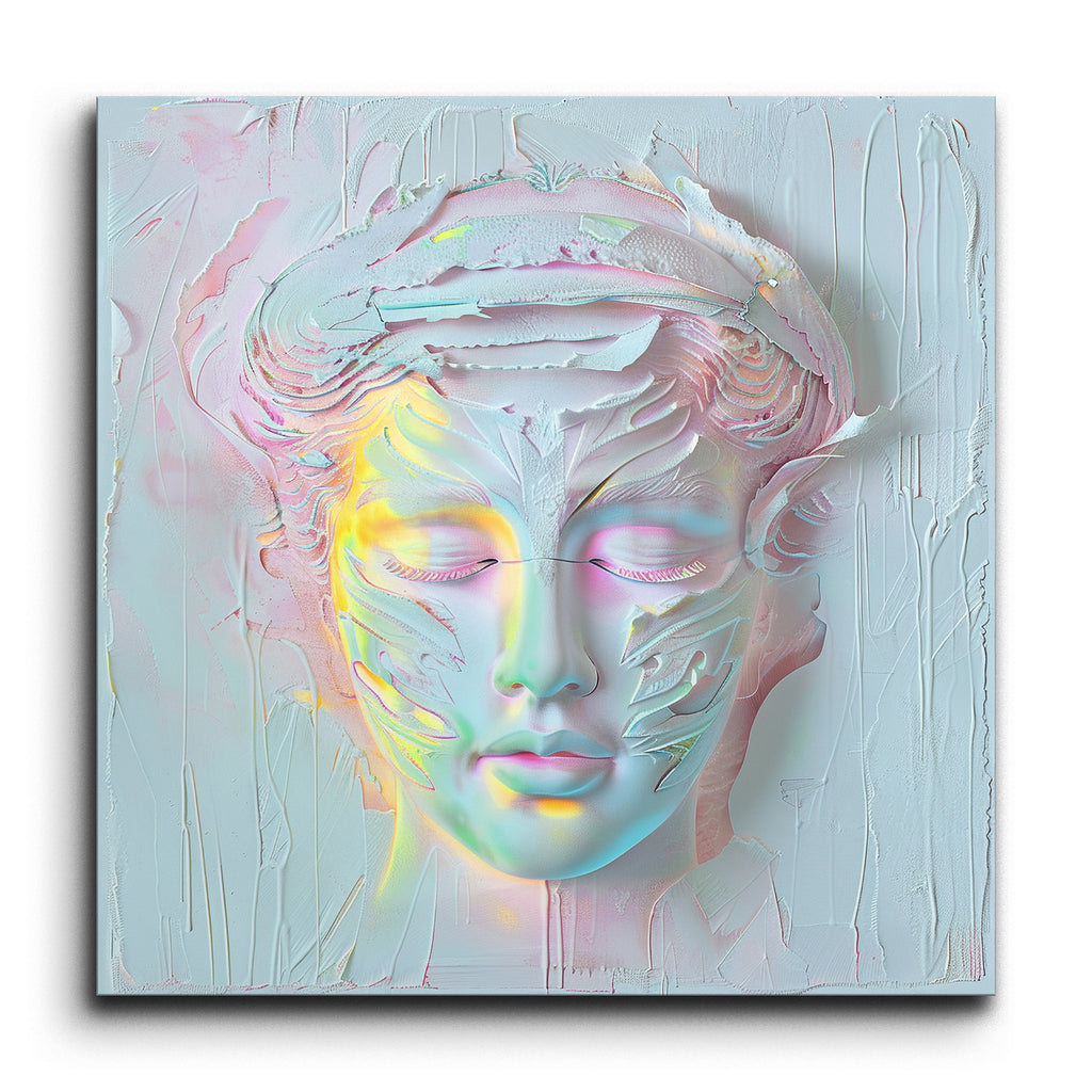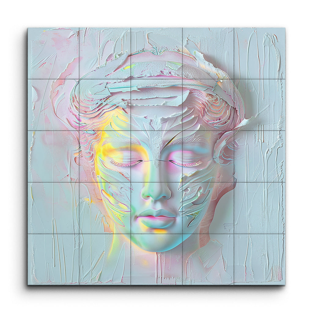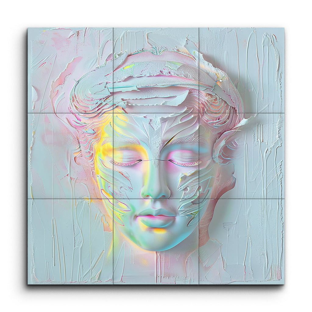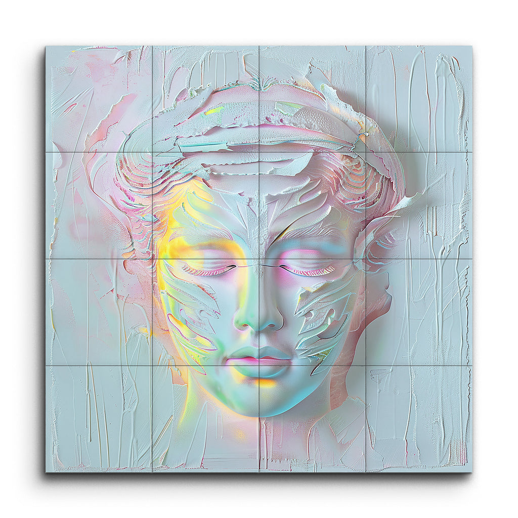 Transform your space with this captivating tile mural that portrays a serene human face with closed eyes, radiating calm and tranquility. The three-dimensional effect, created by thick, impasto strokes, gives the piece a sculptural quality. Soft pastel hues of blue, pink, and yellow blend seamlessly, forming a soothing gradient. Merging classical and contemporary styles, this artwork evokes otherworldliness, inviting viewers to immerse themselves in its ethereal beauty and intricate details.