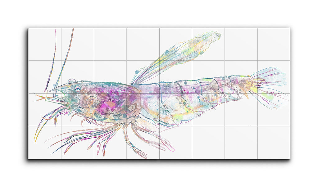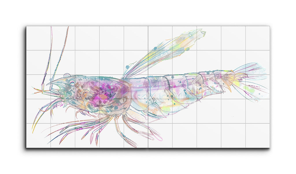 This two-panel tile mural showcases a stylized shrimp, rendered with delicate lines and a subtle interplay of pastel colors. The shrimp's form is suggested through fine, freehand lines and watercolor-like washes, blending hues of pink, purple, blue, green, and yellow. The artwork balances between figuration and abstraction, capturing the shrimp's ethereal, translucent essence. The use of negative space highlights the shrimp, inviting viewers to appreciate its fluid, dreamlike quality.