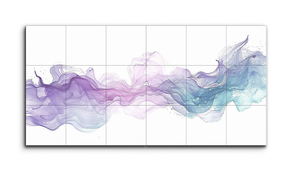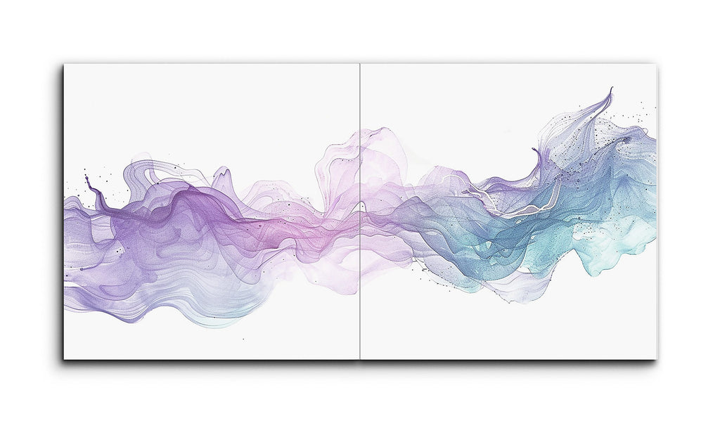 This diptych tile mural features an abstract design with fluid, swirling forms reminiscent of smoke. The artwork conveys movement and ethereality through its soft pastel palette of purple, pink, and blue, which blend seamlessly to create a harmonious gradient. Organic, flowing shapes overlap with transparent layers, adding depth and complexity. The contemporary style, possibly linked to digital art techniques, offers a calming and meditative visual experience.