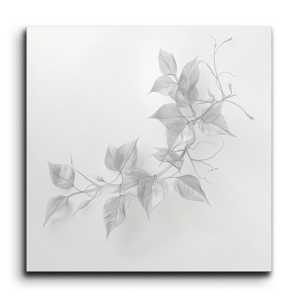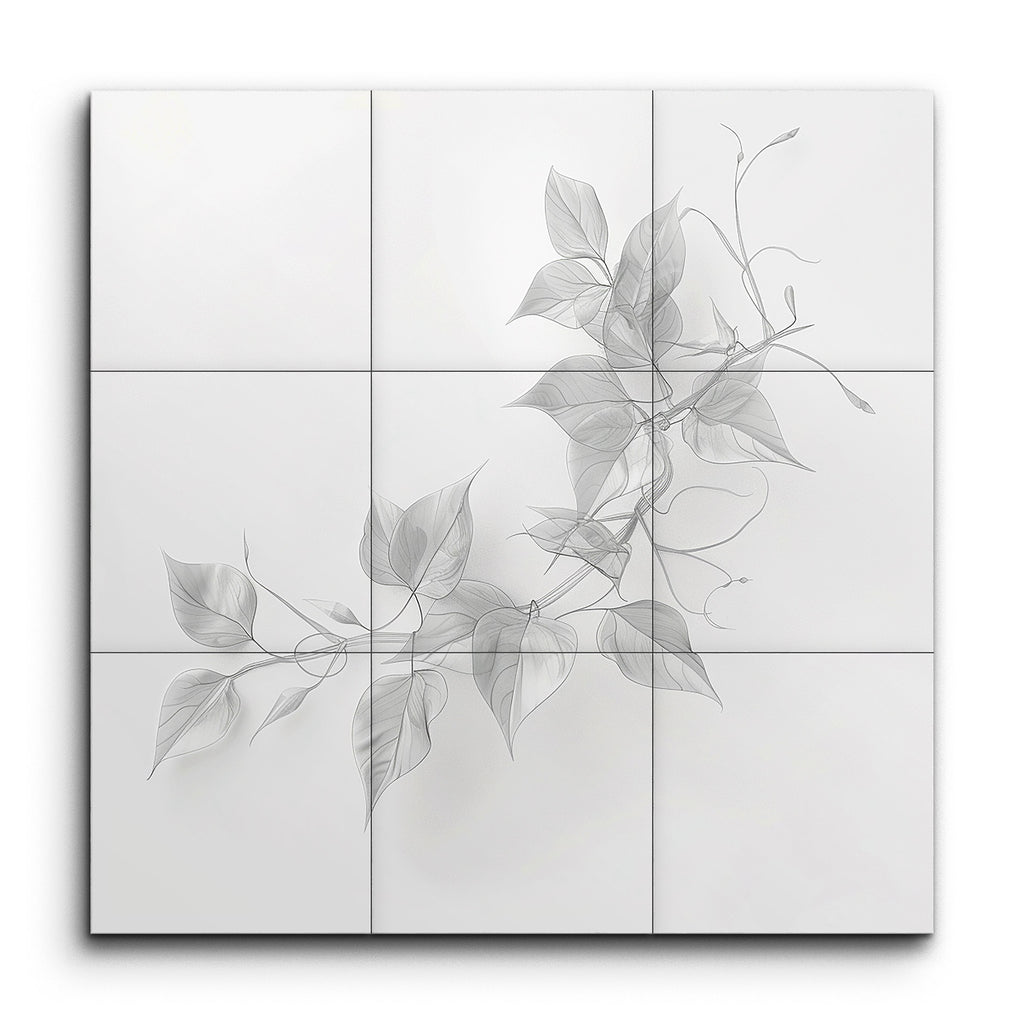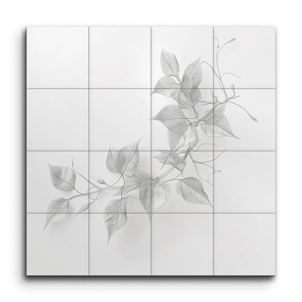 Transform your space with our exquisite tile mural, featuring a delicate vine with intricately detailed leaves. Each leaf showcases lifelike veins and subtle shading variations, capturing nature's elegance. The gracefully winding vine, with its intertwining tendrils and stems, creates an organic, fluid composition. Rendered in grayscale, this minimalist artwork exudes a soft, ethereal quality, emphasizing the beauty of natural forms in their purest essence.