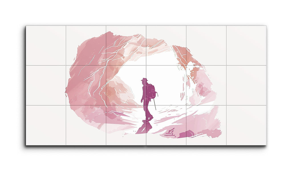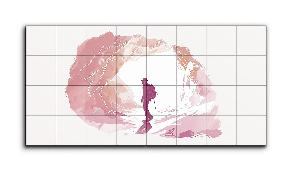 This diptych tile mural presents a stylized figure standing in a natural setting reminiscent of a cave or rock formation. Soft pastel hues of pink, white, purple, and beige blend fluidly, creating an ethereal landscape. The central figure, simplified and almost silhouetted, appears equipped for hiking with a backpack and walking stick, pausing in contemplation. The modern, minimalistic style emphasizes form and color, evoking solitude and the grandeur of nature.