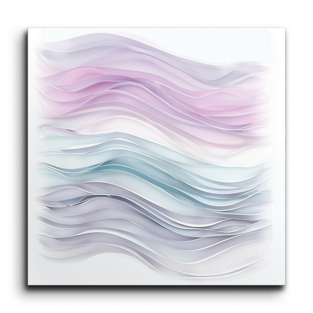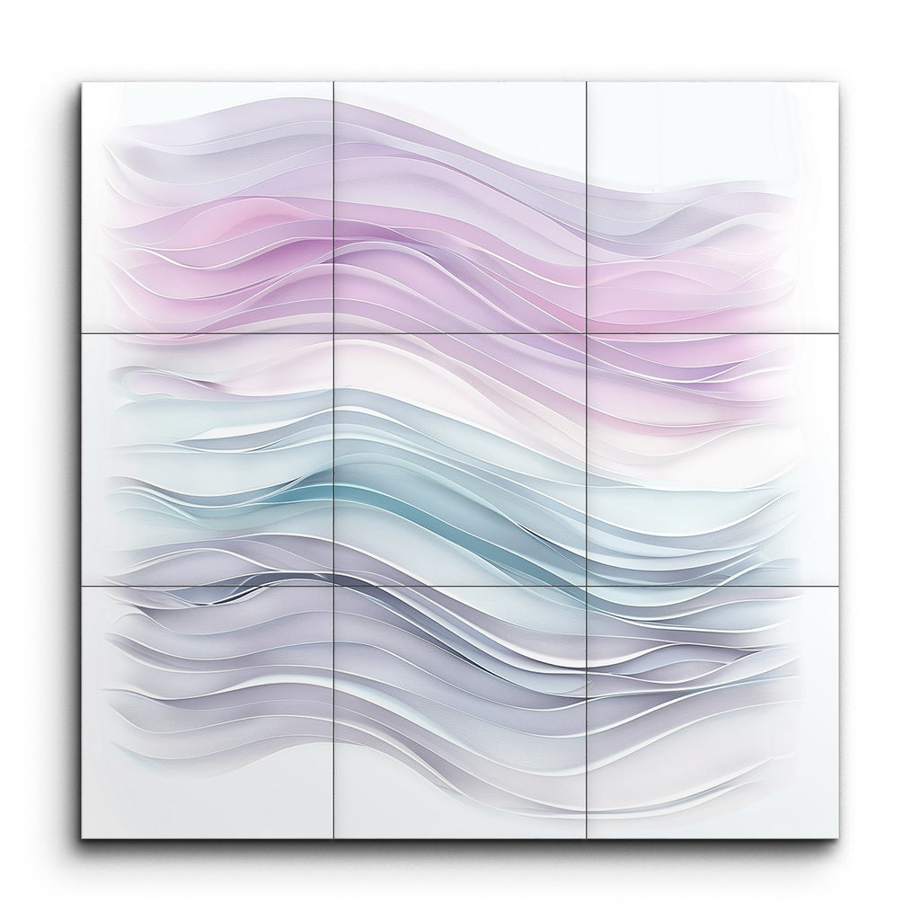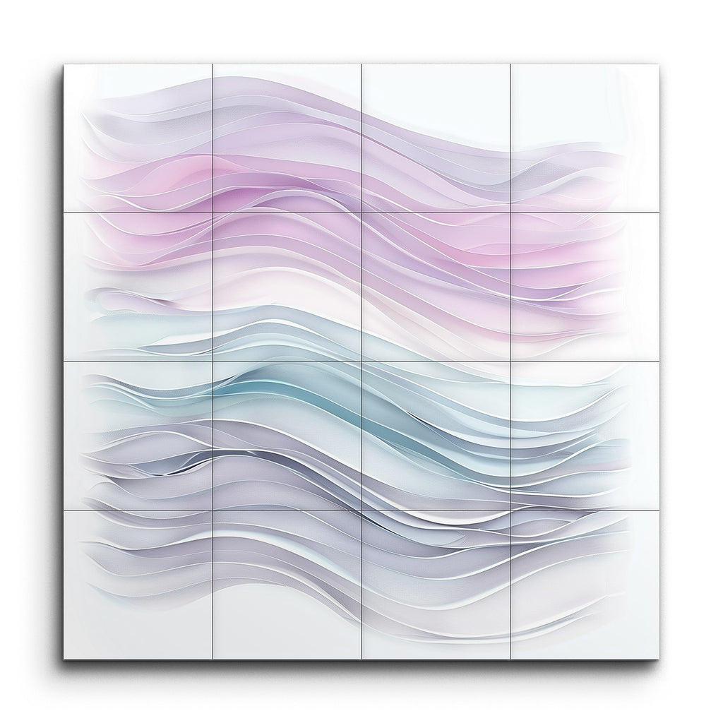 Transform your space with our captivating tile mural, featuring an abstract, modern design that exudes serenity and fluidity. The artwork showcases flowing, wave-like forms, divided into two harmonious sections. The top section enchants with soft pastel hues of pinks and purples, creating a soothing ambiance. Below, cooler tones of blues and grays evoke calm and tranquility. Smooth gradients and layered waves enhance the three-dimensional quality, inviting you to immerse yourself in its serene, ethereal beauty.