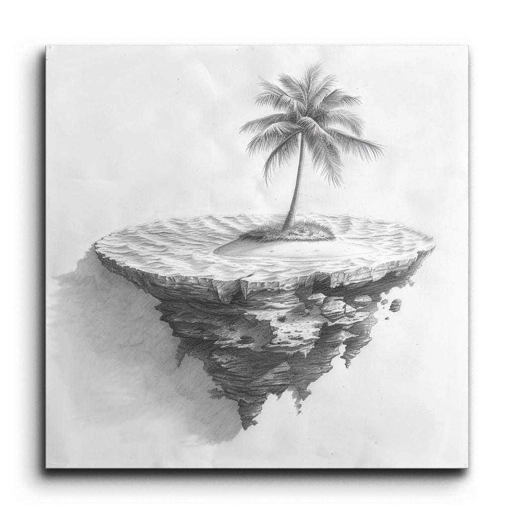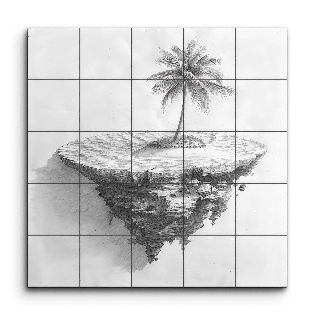 Transform your space with this mesmerizing tile mural featuring a detailed pencil drawing of a floating island. The island's jagged underside and pointed taper evoke a sense of it being torn from the earth, while the surface is textured with fine lines resembling sand. A single, tall palm tree stands majestically at the center, its intricately drawn fronds swaying with lifelike movement. The masterful shading and light create a stunning three-dimensional effect, blending realism with a touch of surrealism.
