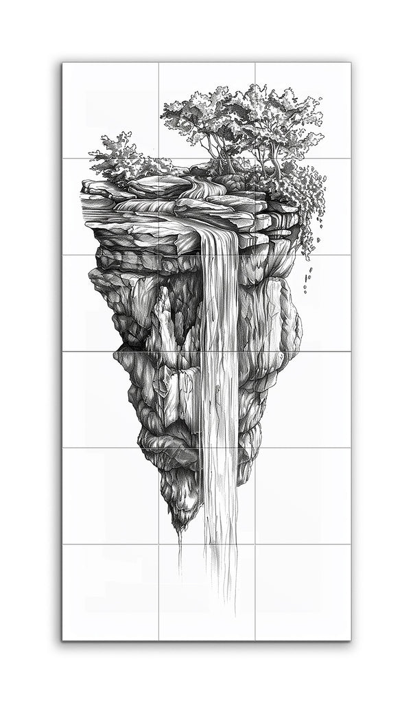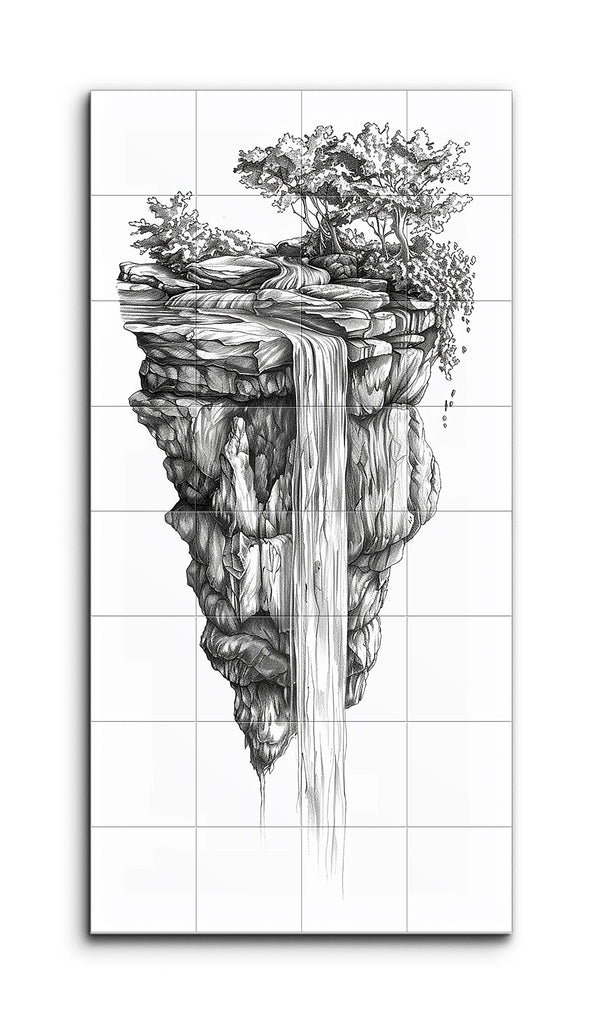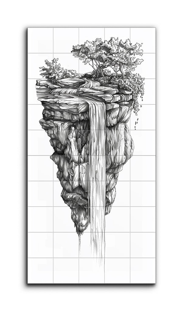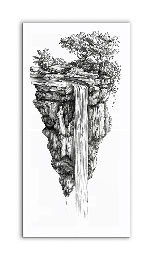 The artwork presents a floating island with a waterfall cascading from its rugged, rocky surface. Intricate line work showcases the island's textured layers, topped with finely detailed trees and bushes. The waterfall flows smoothly, with varying line thickness capturing its movement and fluidity. Monochromatic shades of black and white create contrast and depth, blending realism with a fantastical floating island concept. The detailed line work and shading emphasize the intricate and dynamic composition of the scene.