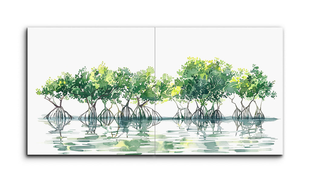 This diptych tile mural captures a serene aquatic landscape with a row of mangrove trees, their intricate root systems prominently displayed above the waterline, giving them a distinctive, floating appearance. The predominantly green color palette, with hints of yellow, suggests sunlight filtering through the lush foliage. Loose, expressive watercolor brushstrokes create a dreamy, impressionistic feel, with gentle ripples and subtle color variations evoking the tranquil movement of water.