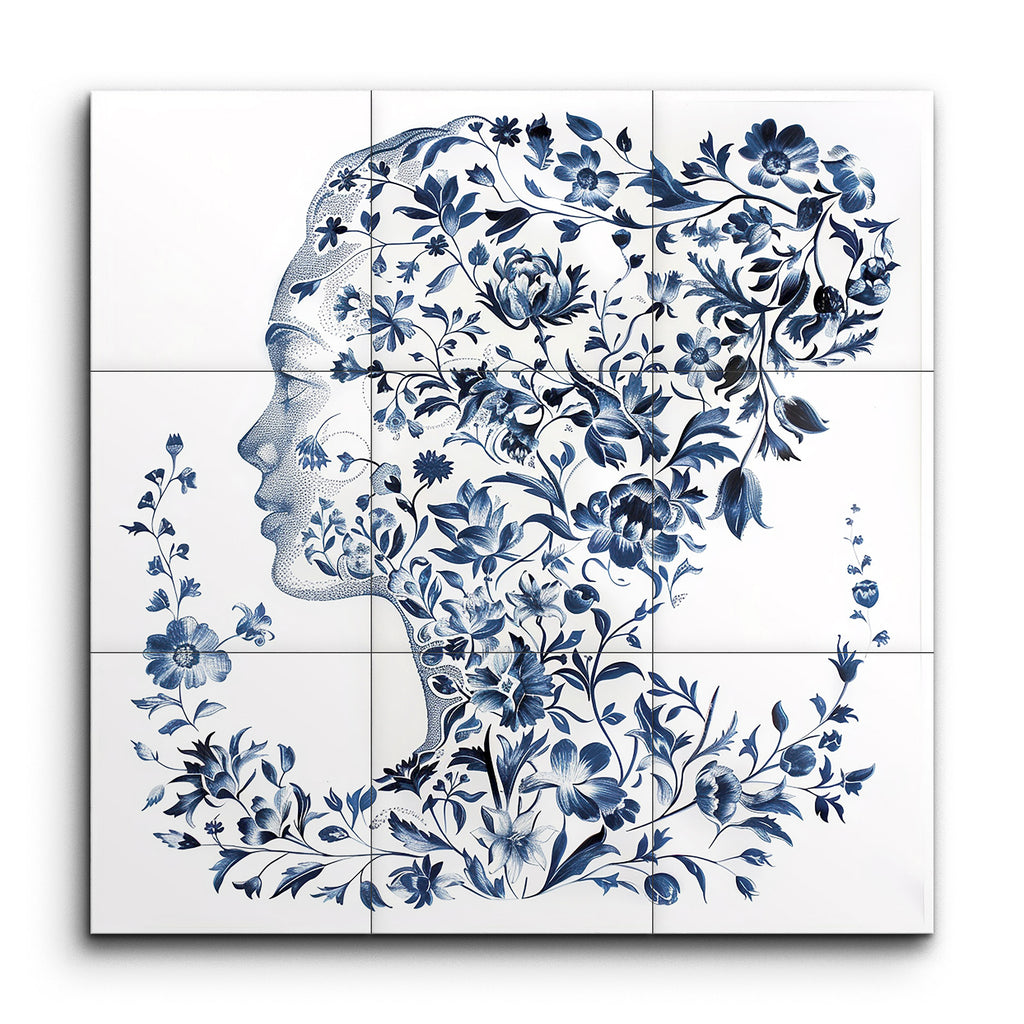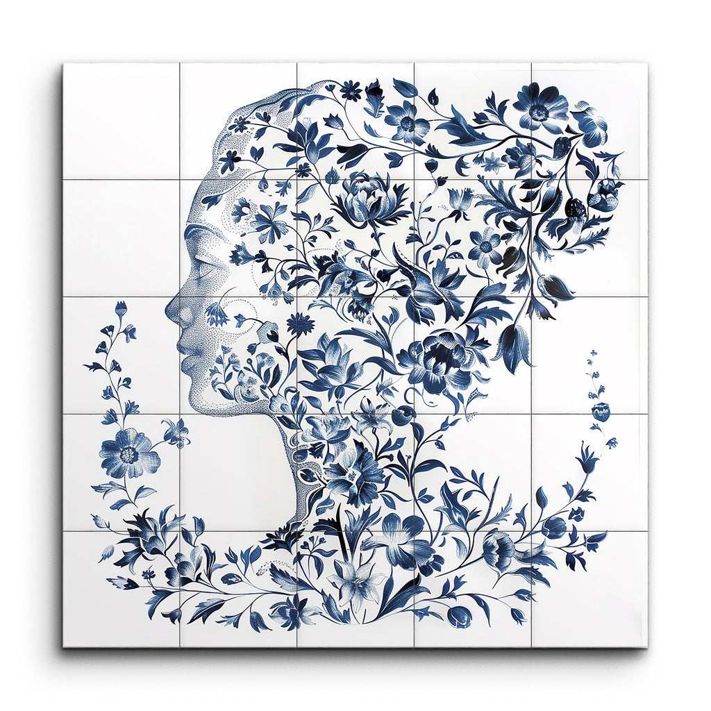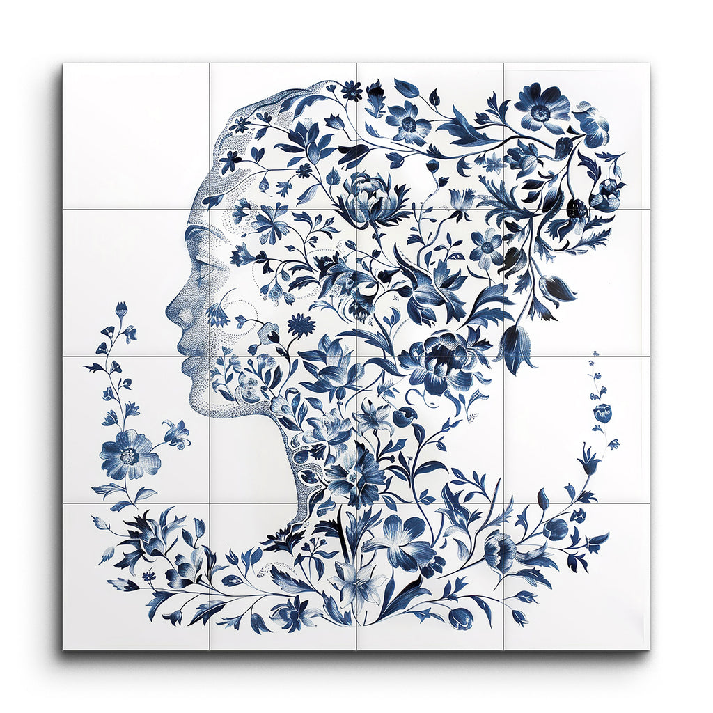 Immerse yourself in the timeless elegance of this captivating tile mural, featuring a woman's profile masterfully crafted from intricate floral and botanical elements. Predominantly in shades of blue, the delicate flowers and leaves form the contours of the face, hair, and neck, evoking the classic beauty of traditional blue and white porcelain designs. The fine lines and detailed shading bring depth and realism to the piece, seamlessly blending portraiture and botanical illustration into a harmonious and visually stunning artwork.