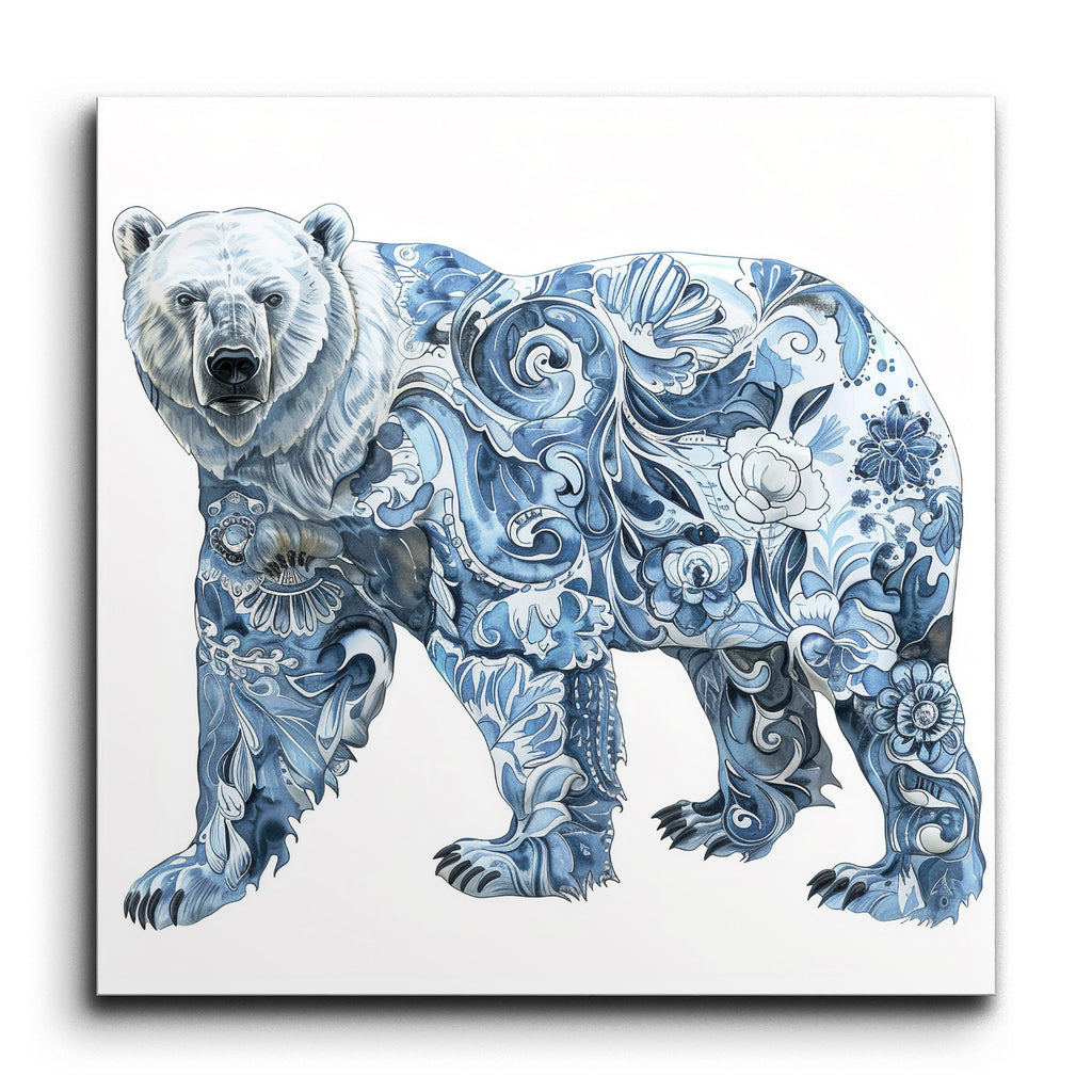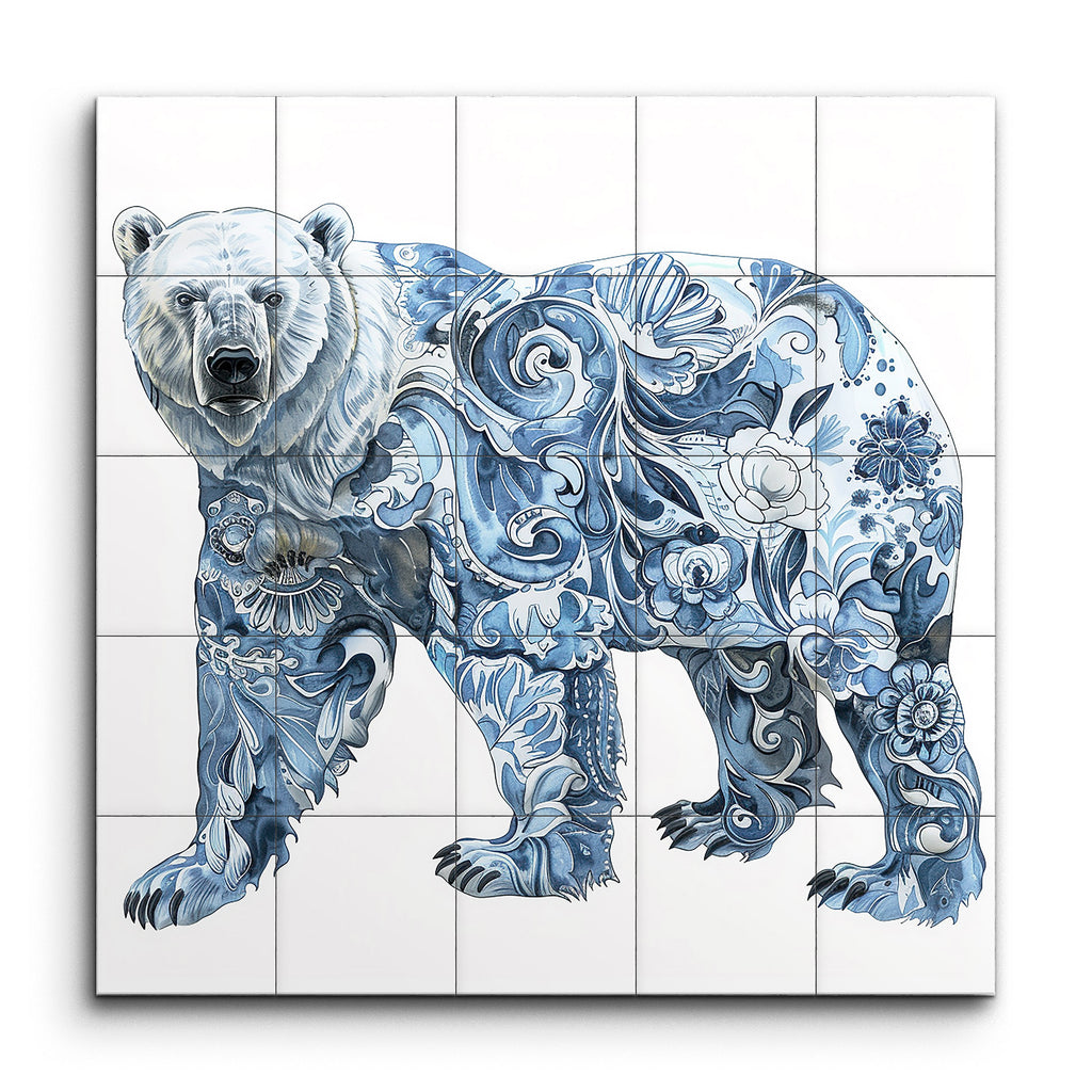 Immerse your space in the captivating beauty of our tile mural, featuring a polar bear adorned with elaborate floral and ornamental patterns. Predominantly in shades of blue and white, the bear's form is a rich tapestry of swirling vines, leaves, and flowers, reminiscent of traditional ceramic designs. The realistically detailed face and paws contrast beautifully with the stylized body, creating a unique and visually striking composition that adds a touch of luxury to any setting.
