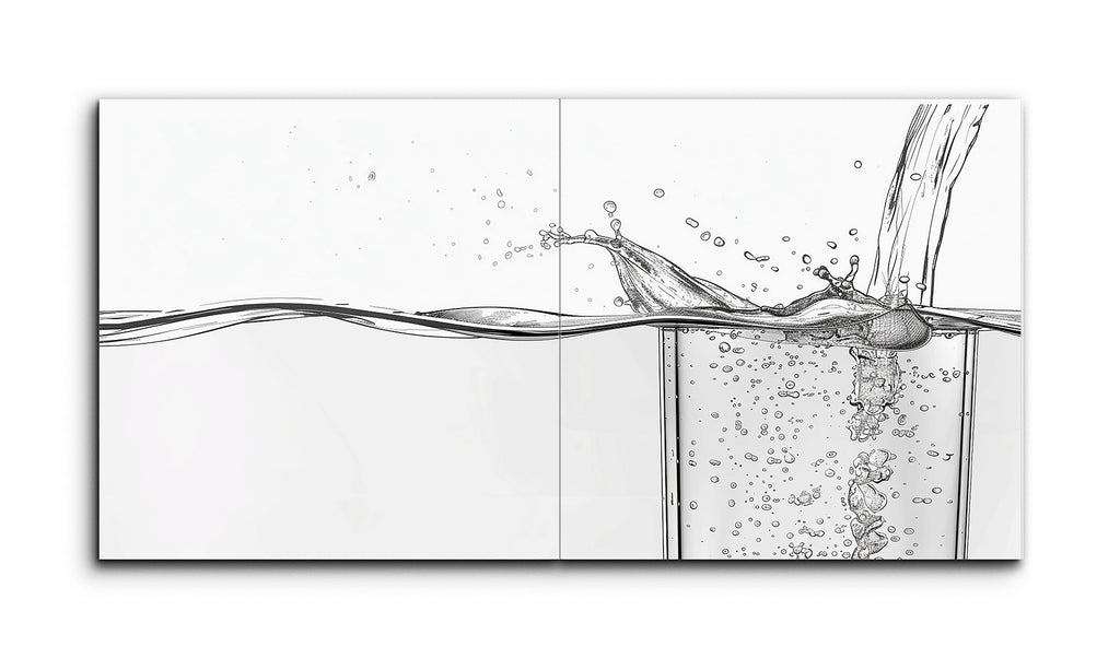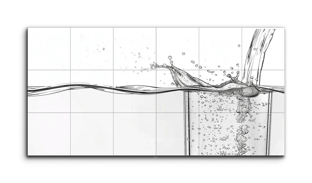 This tile mural presents a meticulously detailed scene of water being poured into a glass. The minimalist, monochromatic style employs fine lines and shading to capture the motion and texture of the liquid. Mid-pour, the water creates a splash, with droplets and bubbles frozen in various stages of movement. Gentle waves and ripples on the water's surface add to the fluidity, while precise line work and subtle shading suggest the glass's transparency, enhancing the realism and depth of the artwork.