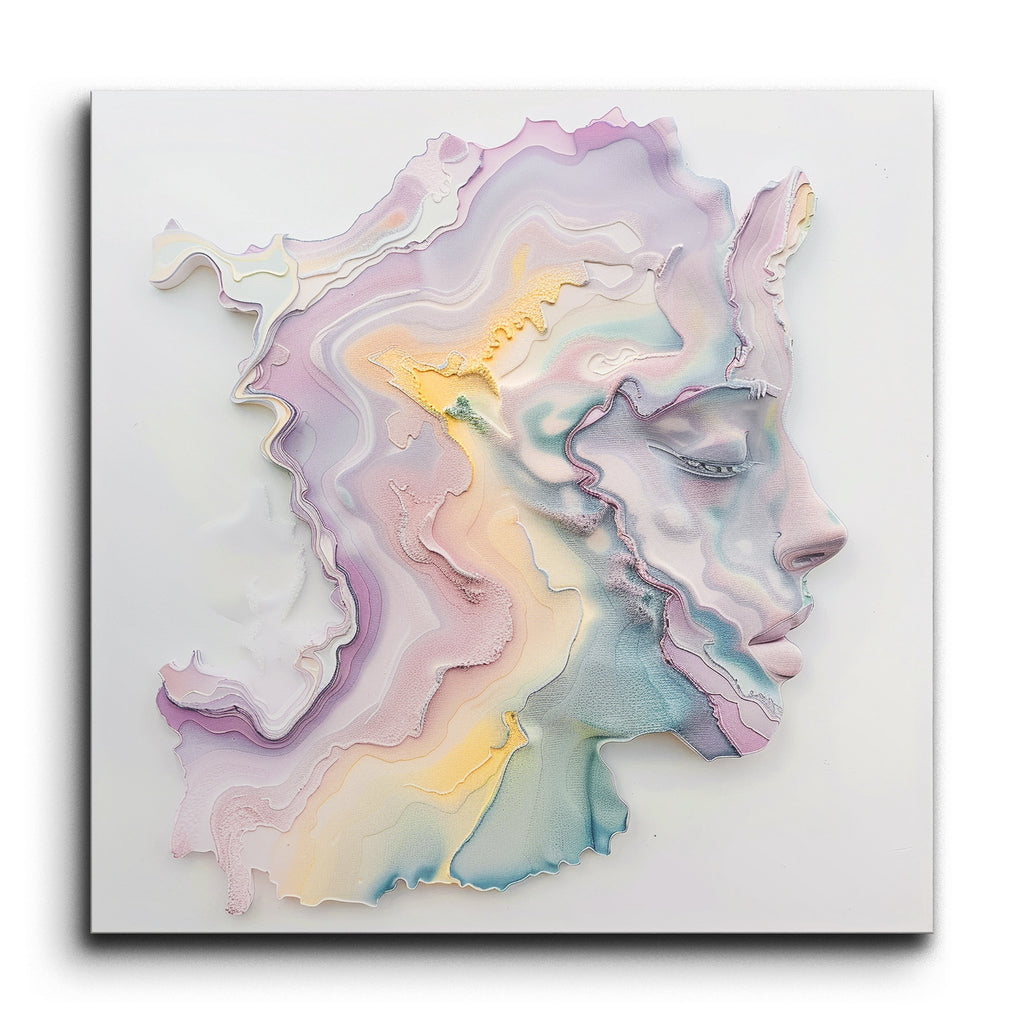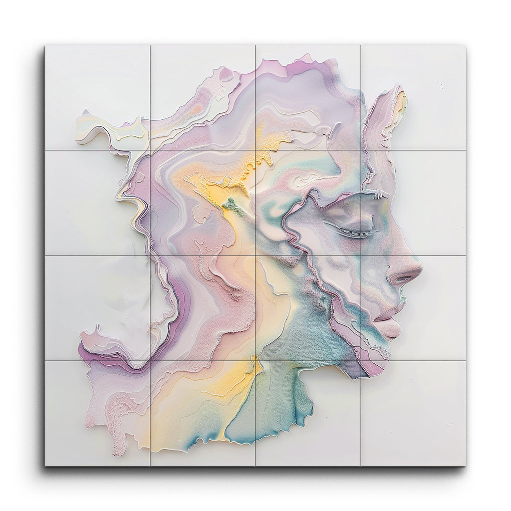 Transform your space with this captivating tile mural, featuring an abstract profile of a human face rendered in fluid, wave-like patterns. The artwork's pastel hues of pink, purple, blue, yellow, and green blend seamlessly, creating a sense of movement and depth. Rich textures add a three-dimensional quality, making the face appear as if it is emerging from the surface. Ethereal and dynamic, this mural invites endless interpretation, adding a dreamlike and thought-provoking element to any room.