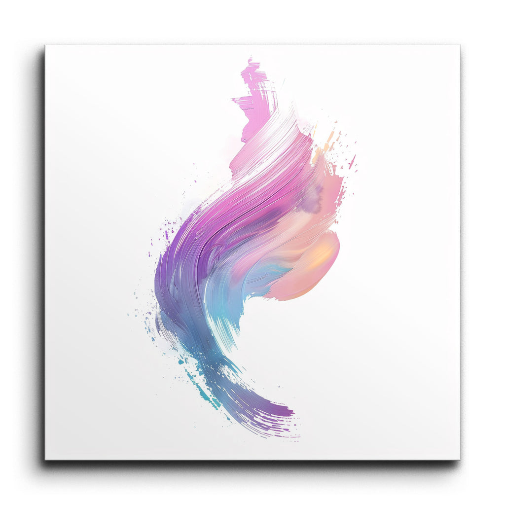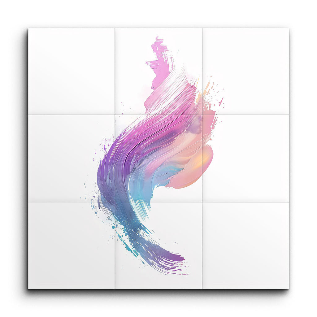 Immerse your space in the captivating energy of our tile mural, showcasing a dynamic, abstract brushstroke that flows with a singular, fluid motion. This stunning artwork transitions from soft purples and pinks at the top to vibrant blues and teals at the bottom, creating a mesmerizing gradient. The varied texture, with areas of opacity and translucence, adds depth and movement, while frayed edges and splatters convey spontaneity and vitality. The flame-like shape suggests growth and ascension, evoking fluidity and grace.