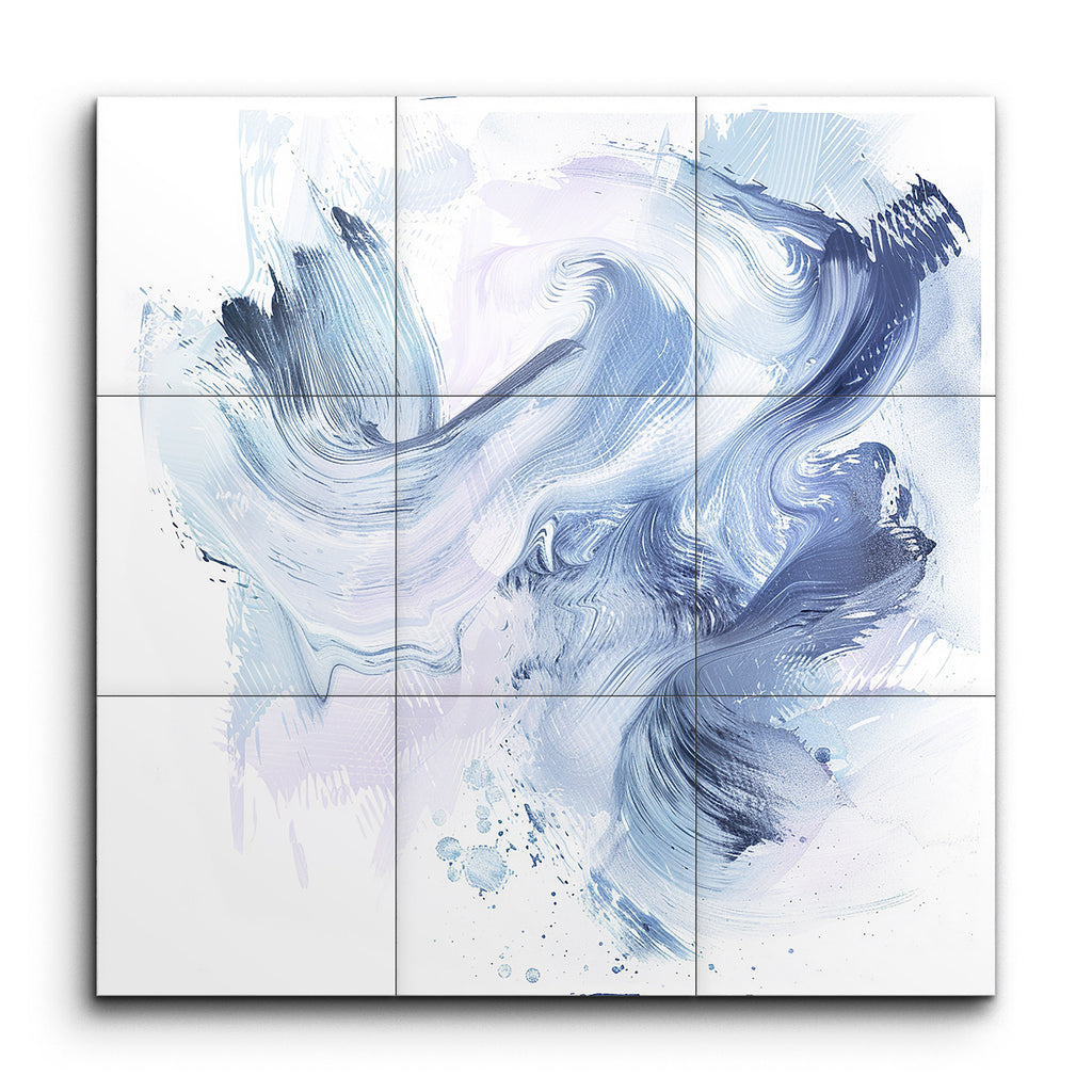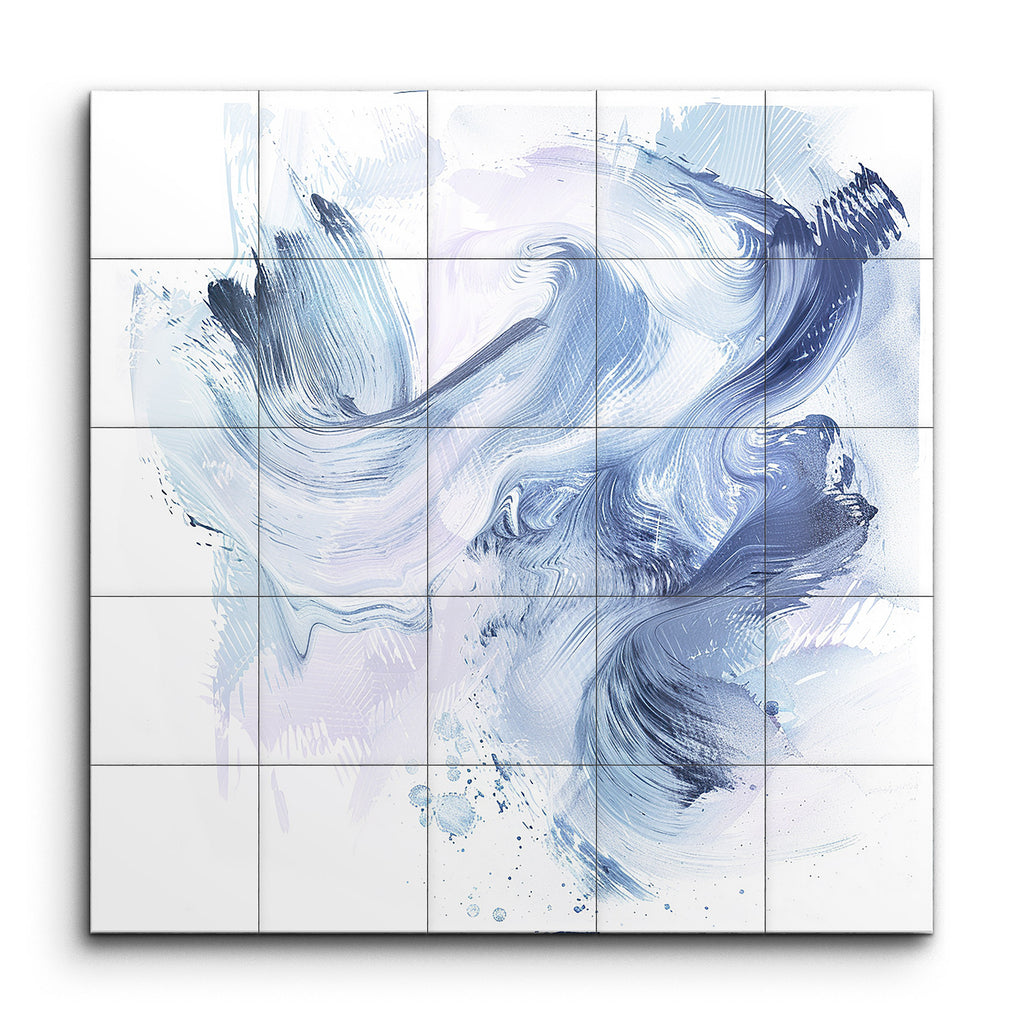Transform your space with this captivating tile mural, showcasing a dynamic and fluid composition of sweeping brushstrokes in harmonious shades of blue and hints of light purple. The abstract design emphasizes movement and texture, with varying brushstroke thicknesses creating depth and layering. The interplay of light and dark blues, along with touches of light purple, offers a soothing yet dynamic visual experience, inviting endless exploration and interpretation. Perfect for adding a touch of artistic elegance to any room.