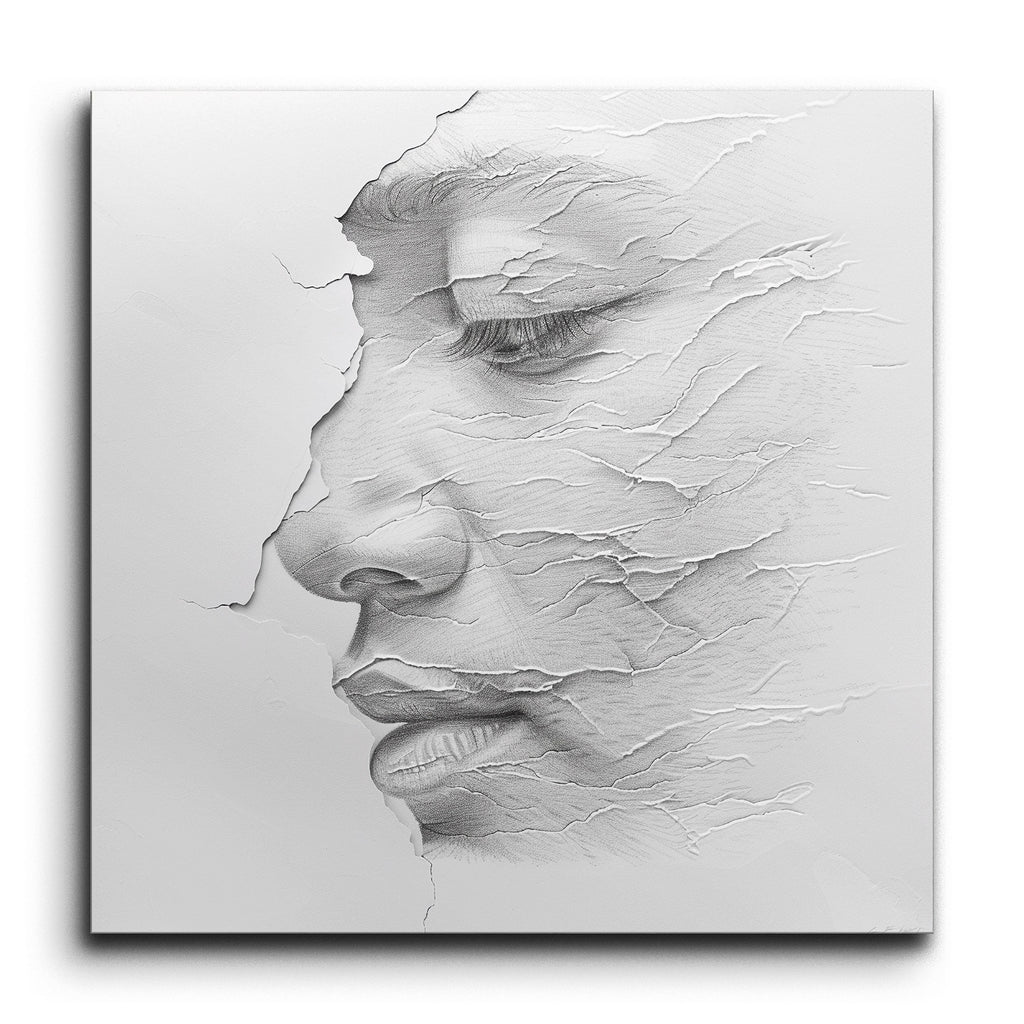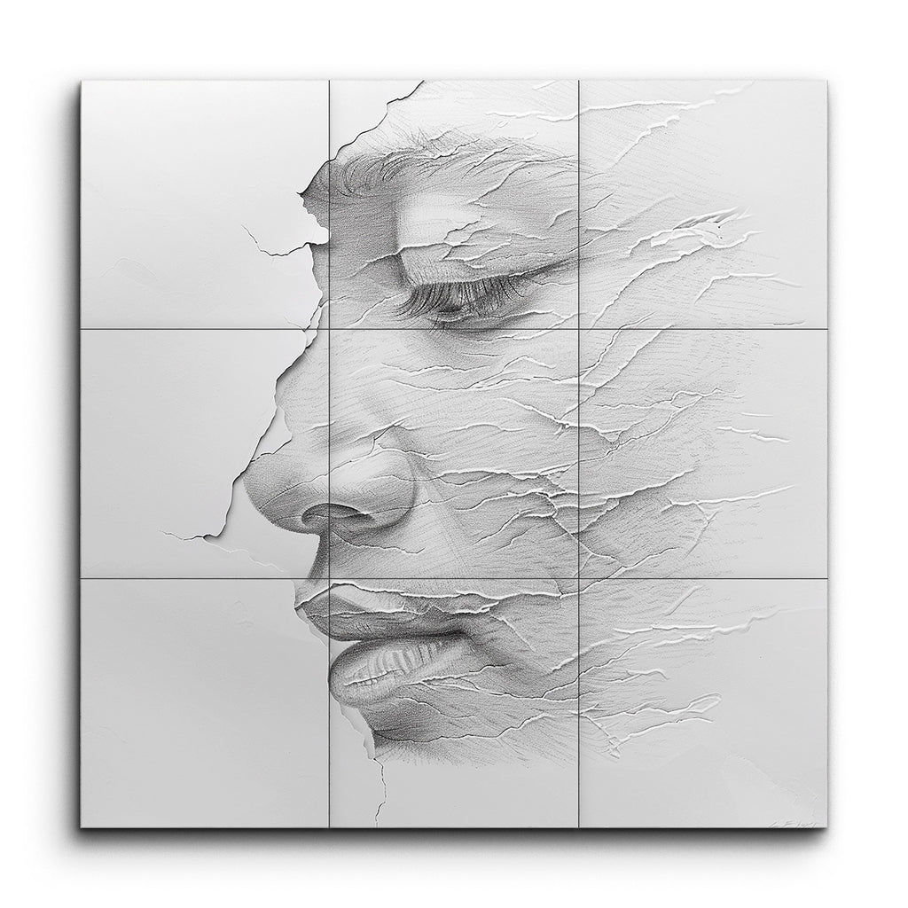 Immerse yourself in the captivating depth of this tile mural, featuring a meticulous close-up profile of a human face. The highly detailed and lifelike depiction captures delicate features with precision, while a unique cracked, peeling effect adds a fascinating layer of complexity. Fissures and crevices run across the face, creating a striking contrast between smooth realism and fragmented texture. The monochromatic shades of gray and the subject's contemplative, melancholic expression evoke a profound sense of introspection.