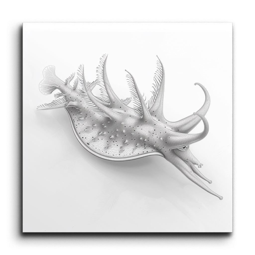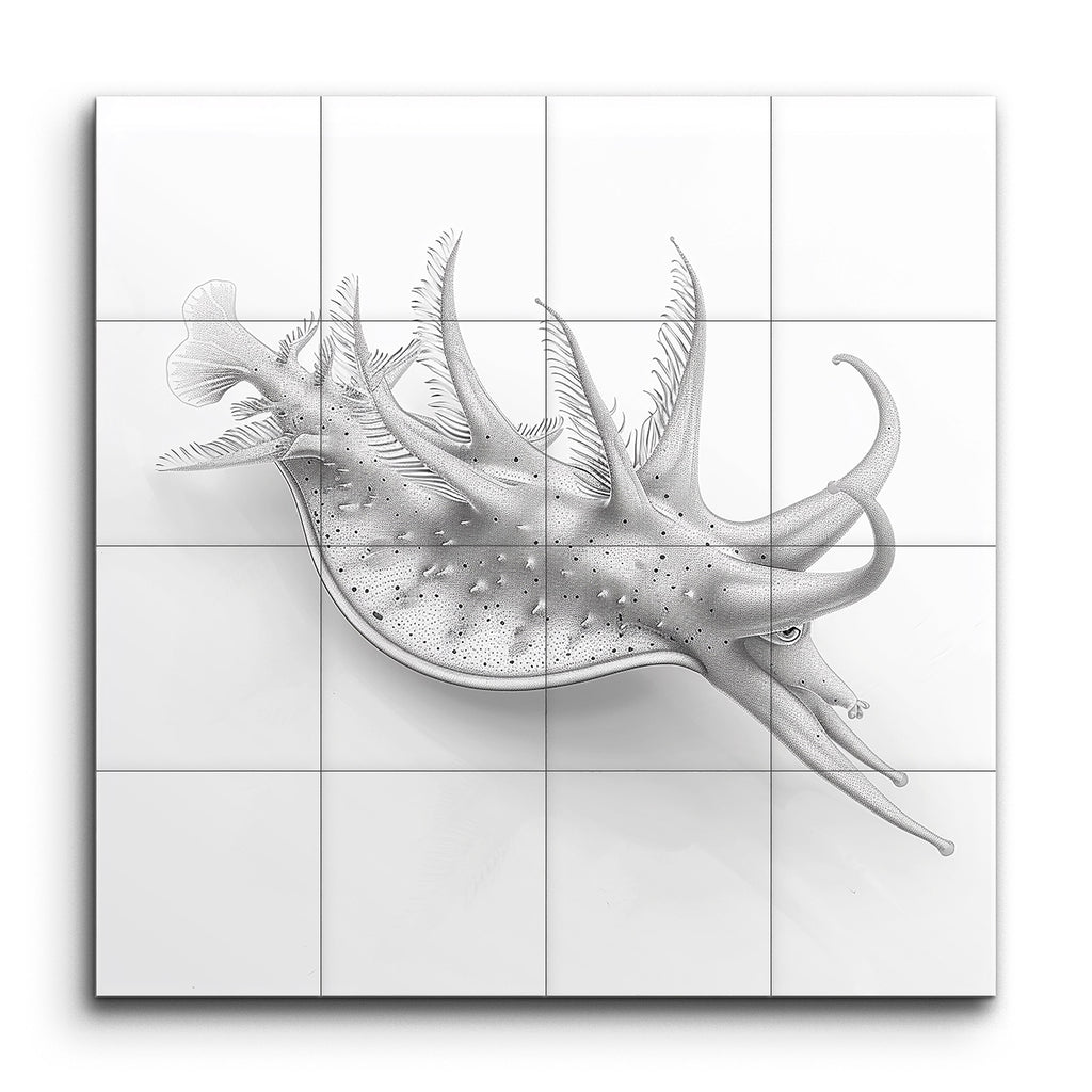 Transform your space with a mesmerizing tile mural featuring a fantastical marine creature. This highly detailed, monochromatic artwork showcases an elongated, sleek body adorned with intricate, spiky protrusions, resembling a fusion of fins and tentacles. The creature's otherworldly head, with its elongated, curved appendages, adds to its alien allure. Meticulously crafted textures and subtle shading create a striking three-dimensional effect, blending organic and mechanical elements for a captivating, futuristic aesthetic.