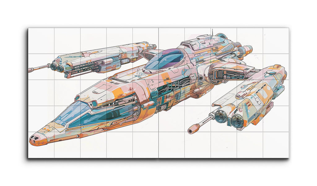 This tile mural features a highly detailed and vibrant artwork of a futuristic spacecraft, reminiscent of science fiction concept art. Rendered with a sense of three-dimensionality, the spacecraft boasts intricate mechanical details like panels, bolts, and seams, suggesting a well-worn machine full of history. The dynamic composition, with the ship angled as if in motion, highlights the engines, weapons, and cockpit, creating a vivid depiction of advanced technology and imagined adventures.