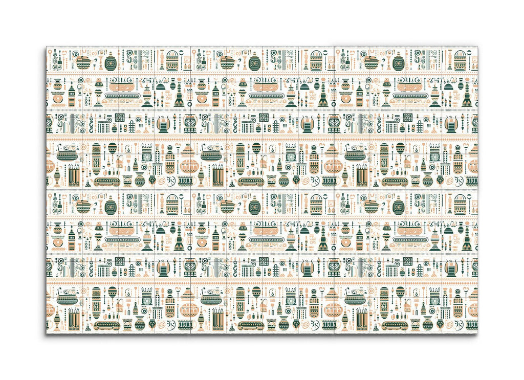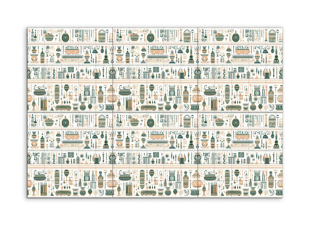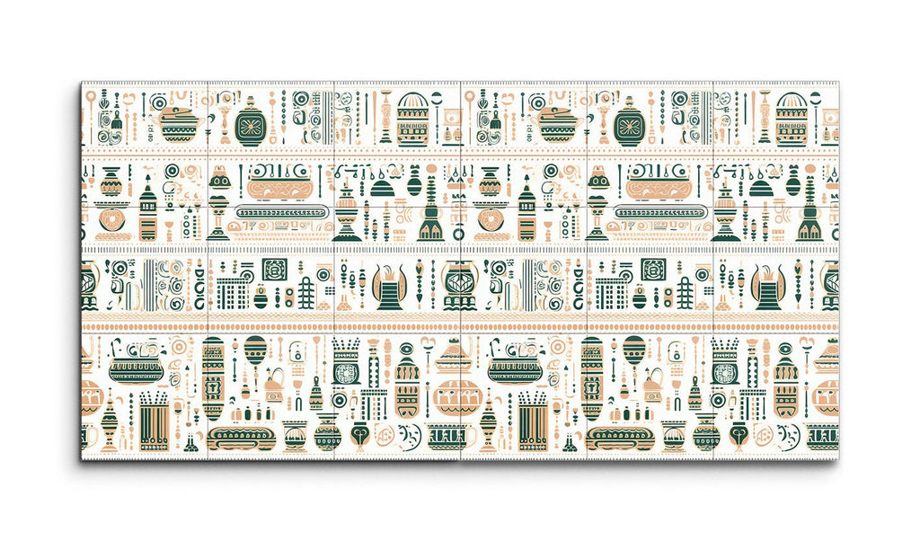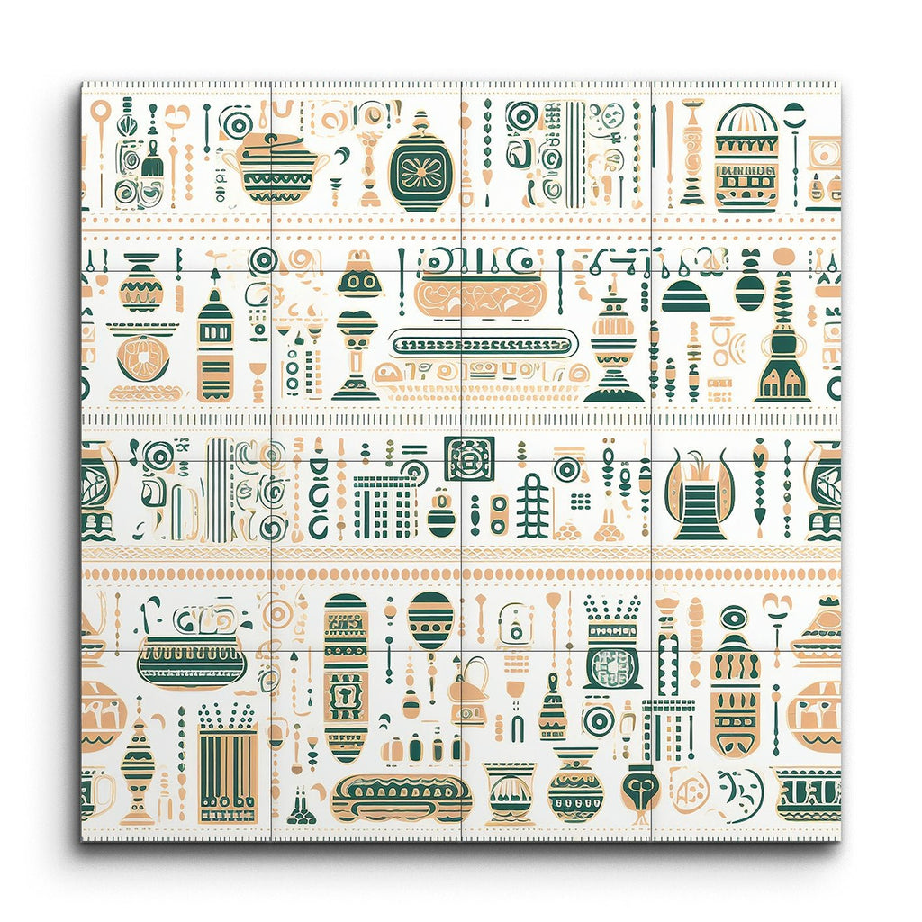 Transform your space with this captivating tile mural, featuring an intricate pattern of geometric shapes and stylized motifs. The design is arranged in harmonious horizontal bands filled with ancient-inspired symbols and forms. Rendered in muted earth tones of green and beige, the artwork evokes a sense of rhythm and continuity. The clean lines and precise shapes give it a contemporary edge, while the detailed patterns pay homage to timeless cultural heritage, inviting endless exploration of its symbolic depths.