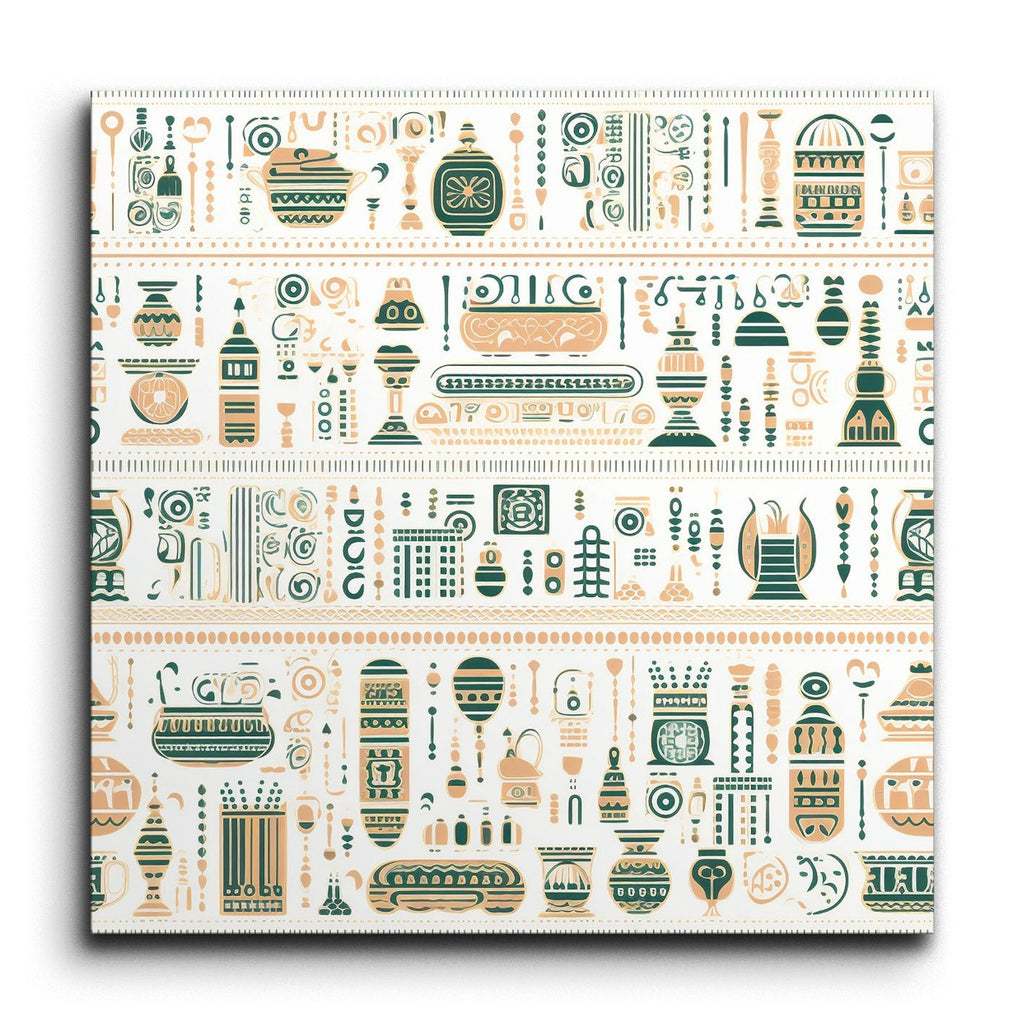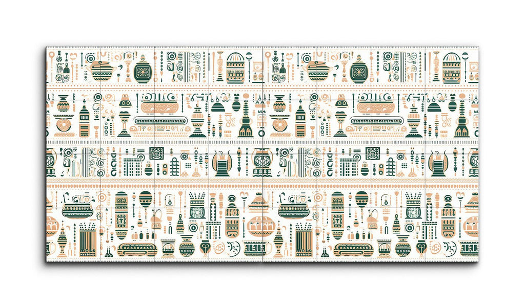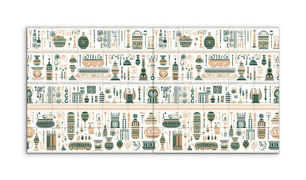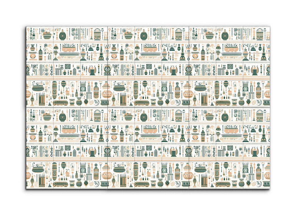 Transform your space with this captivating tile mural, featuring an intricate pattern of geometric shapes and stylized motifs. The design is arranged in harmonious horizontal bands filled with ancient-inspired symbols and forms. Rendered in muted earth tones of green and beige, the artwork evokes a sense of rhythm and continuity. The clean lines and precise shapes give it a contemporary edge, while the detailed patterns pay homage to timeless cultural heritage, inviting endless exploration of its symbolic depths.