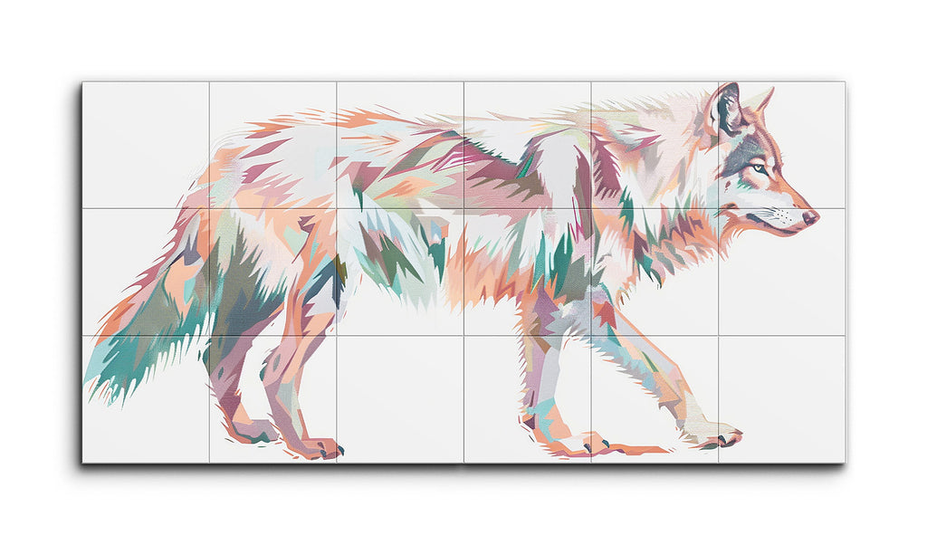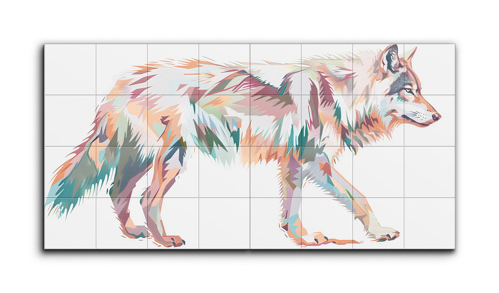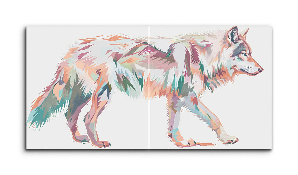 The artwork showcases a stylized wolf in a walking posture, depicted through a geometric, abstract design. Angular shapes and facets filled with shades of pink, blue, green, and beige blend to create a visually striking and dynamic effect. This use of colors and shapes imbues the wolf with a sense of movement and depth, while imparting a modern, almost digital aesthetic. The piece is vibrant and harmonious, capturing the essence of the wolf in a unique, contemporary manner.