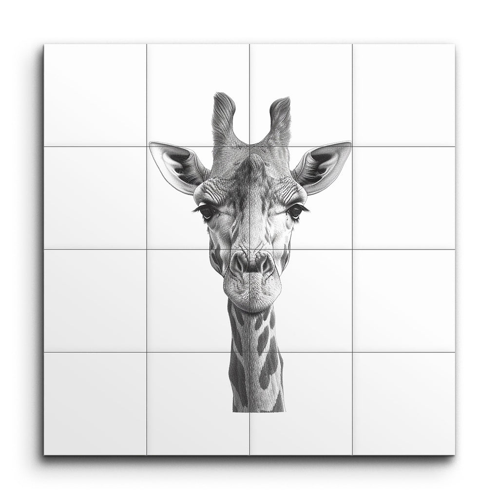Immerse yourself in the captivating beauty of nature with this stunning tile mural, featuring a hyper-realistic depiction of a giraffe's head and neck. Rendered in exquisite grayscale, the intricate shading and fine lines bring to life the texture of the skin, the unique patterns of its spots, and the contours of its facial features. The lifelike eyes draw you in, while the clearly defined ossicones and perked-up ears add to the charm. The masterful use of light and shadow creates a mesmerizing three-dimensional effect, making this artwork a breathtaking focal point for any space.