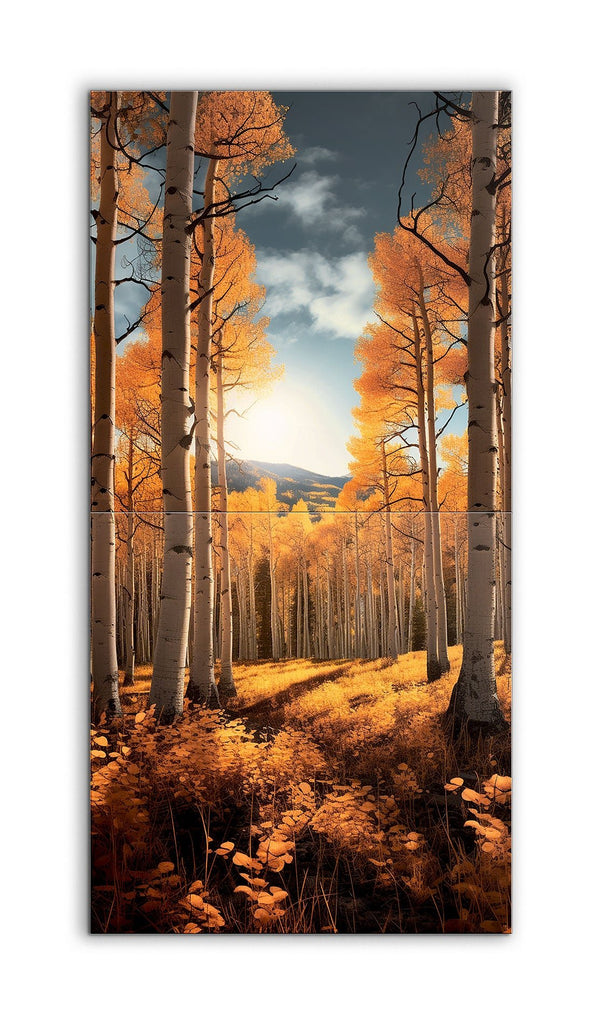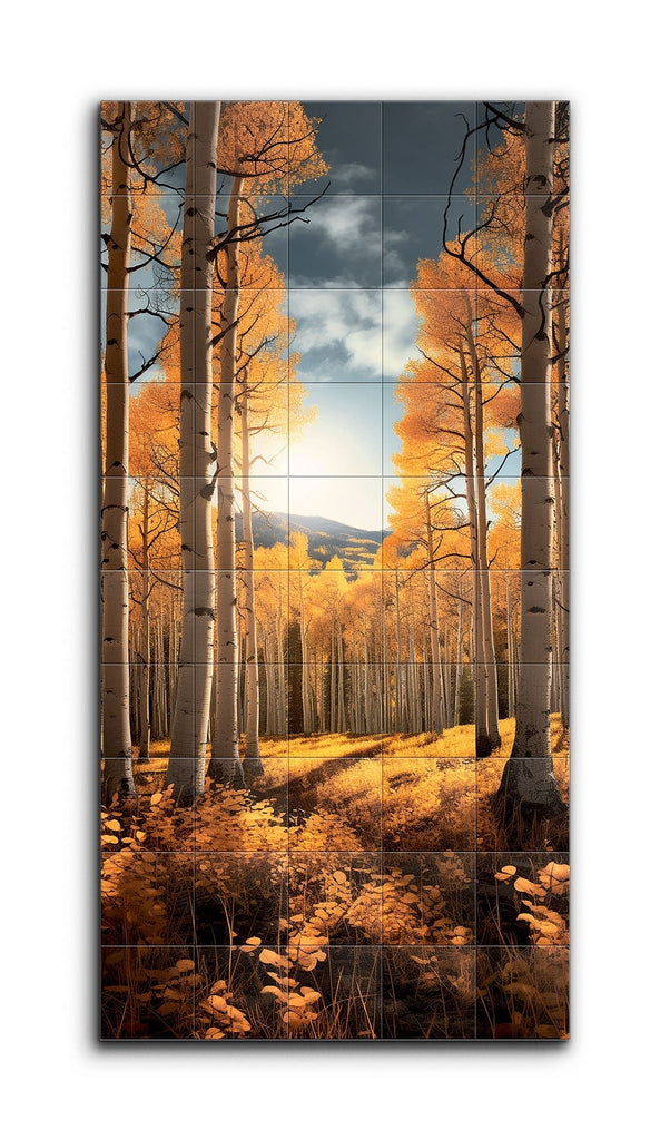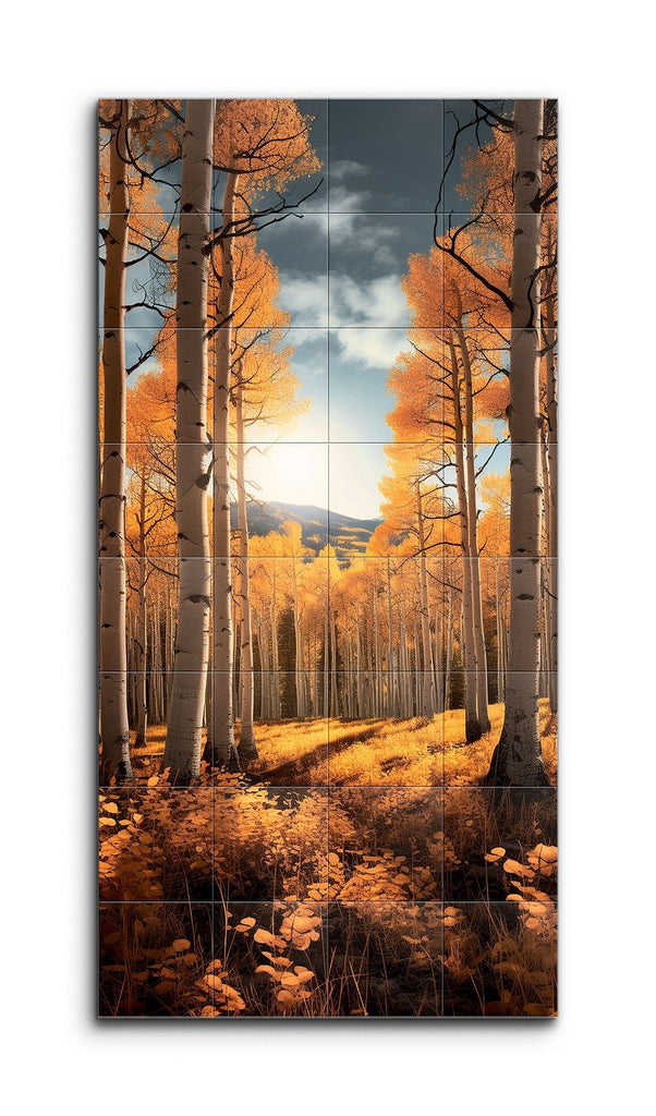 This tile mural captures a serene autumn forest scene with tall, white-barked trees adorned with golden leaves. Light filters through the foliage, casting a soft, golden glow on the forest floor, rich with ferns and low vegetation in shades of orange and brown. A distant mountain peak under a partially cloudy sky adds depth. The highly realistic style meticulously details the textures of bark, leaves, and ground cover, creating a tranquil and peaceful atmosphere.