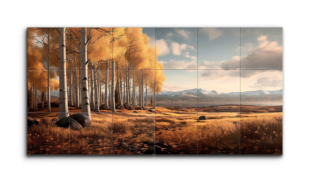 This tile mural showcases a detailed autumn landscape. On the left, tall birch or aspen trees with white bark and golden-yellow leaves stand amidst fallen leaves and grasses in shades of brown and gold. Large, smooth rocks are scattered among the trees. To the right, the forest opens to a vast field of golden grasses, dotted with rocks. Snow-capped mountains stretch across the horizon under a partly cloudy sky, bathed in warm sunlight. The realistic style and rich colors capture the tranquil beauty of this serene autumn setting.