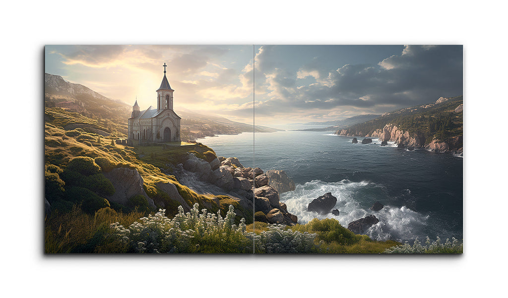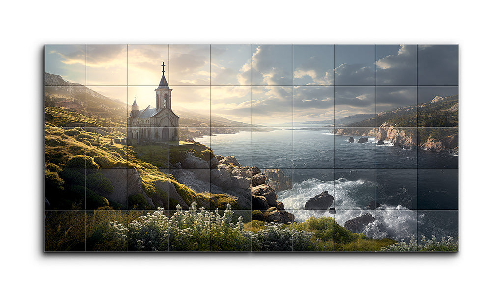 This tile mural showcases a serene coastal landscape with a small, traditional stone church perched on a rocky cliff overlooking the ocean. Bathed in warm, golden sunlight, the church exudes a peaceful and inviting atmosphere. The lush surroundings feature green vegetation and wildflowers amidst rugged boulders, with waves crashing dynamically against the rocks. The detailed, realistic artwork captures the natural beauty and tranquility of the scene, enriched by a harmonious blend of greens, blues, and earthy tones.