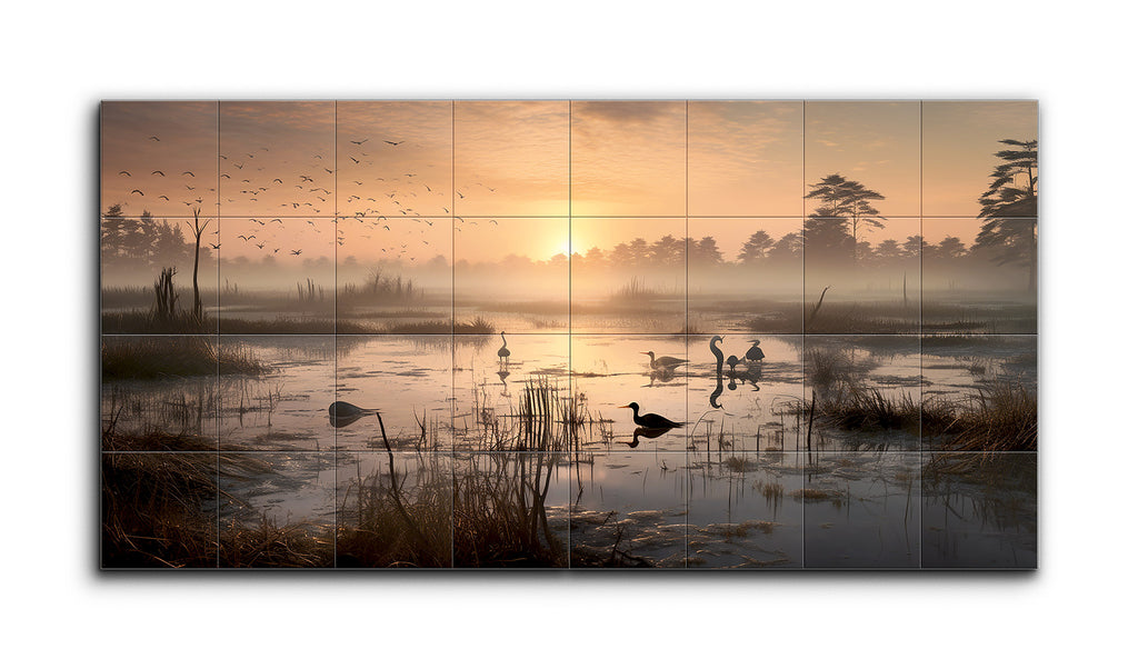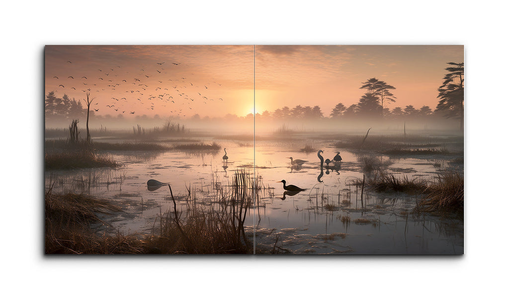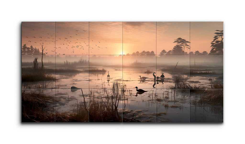 The artwork captures a serene wetland scene at dawn or dusk, with the sun casting a warm, golden light across the landscape. The sky transitions from soft hues of orange and pink to a gentle blue. The calm water reflects the glow and silhouettes of waterfowl, including ducks. Lush vegetation, tall grasses, and reeds add texture. In the background, mist envelops distant trees, enhancing depth. A flock of birds in the sky introduces dynamic movement to the tranquil, realistic yet impressionistic scene.