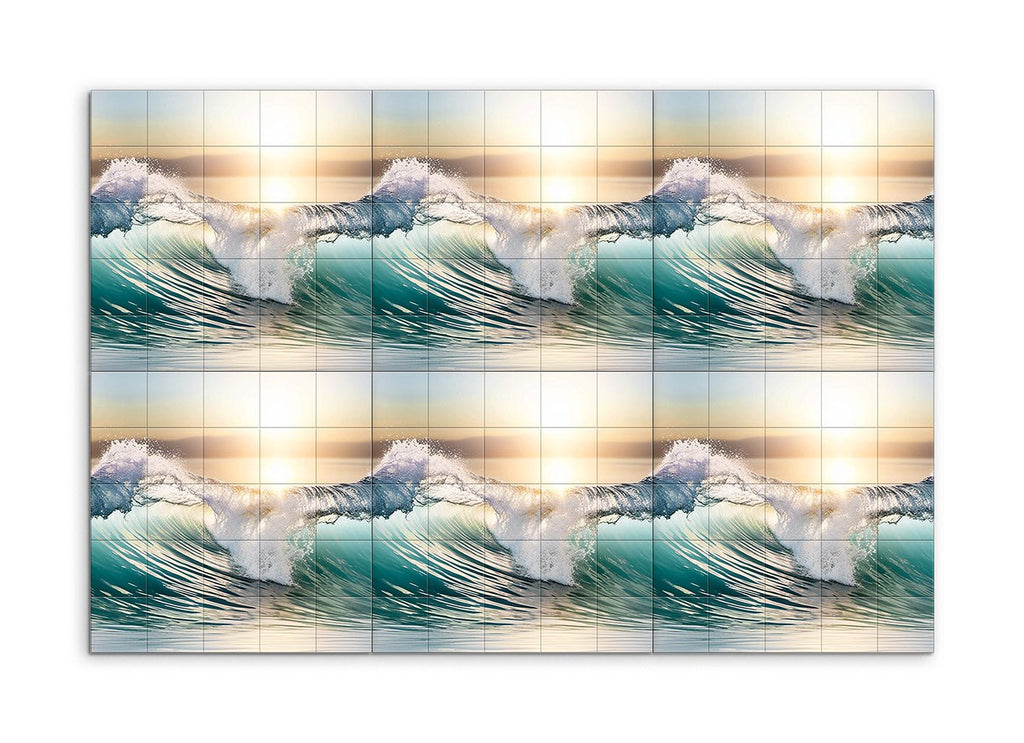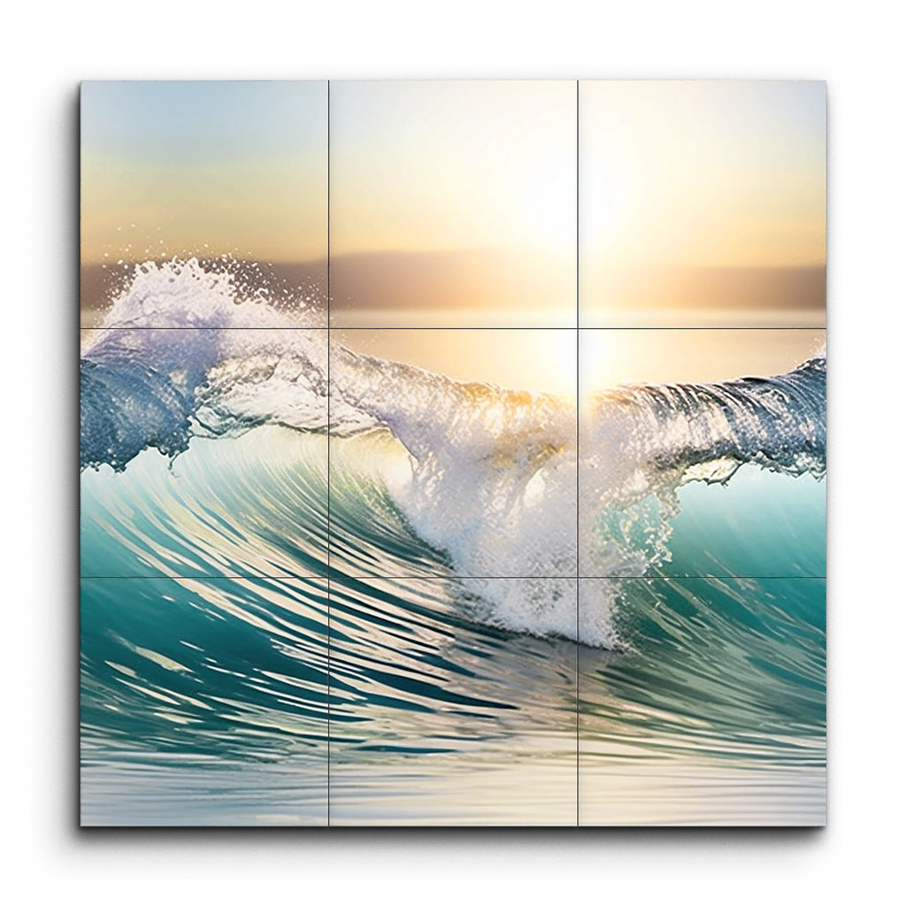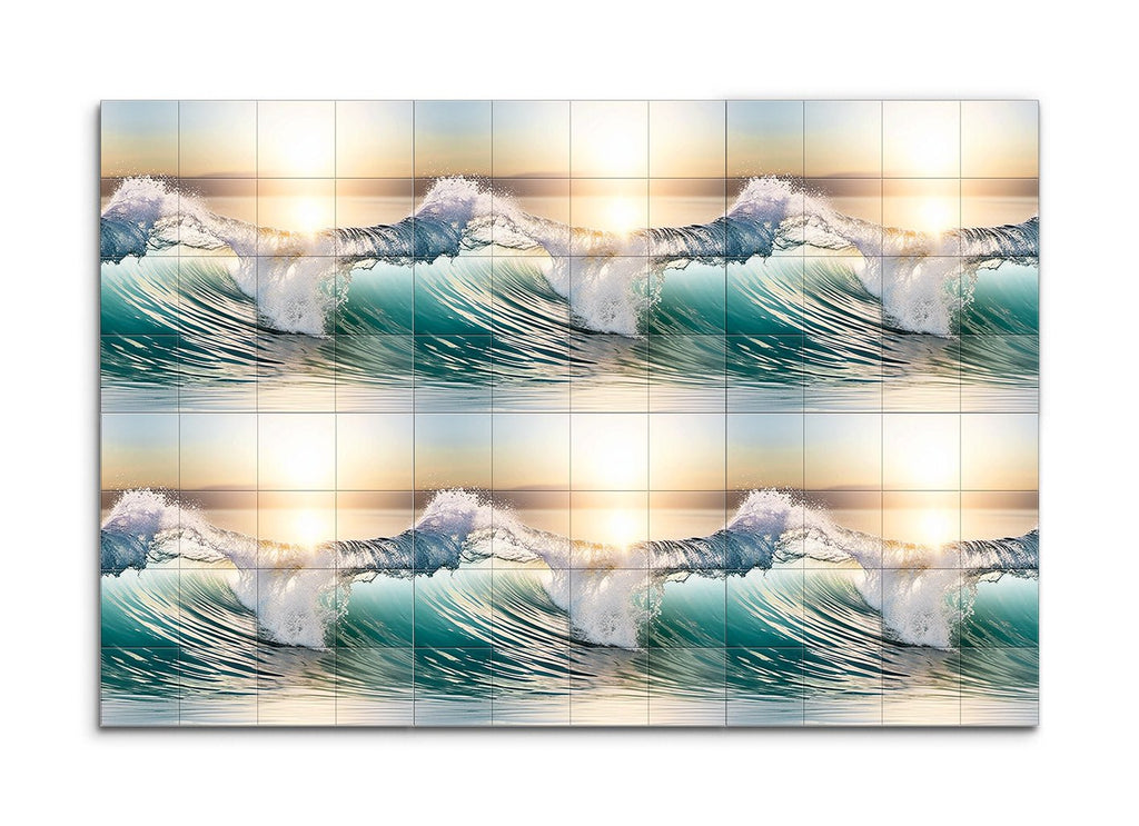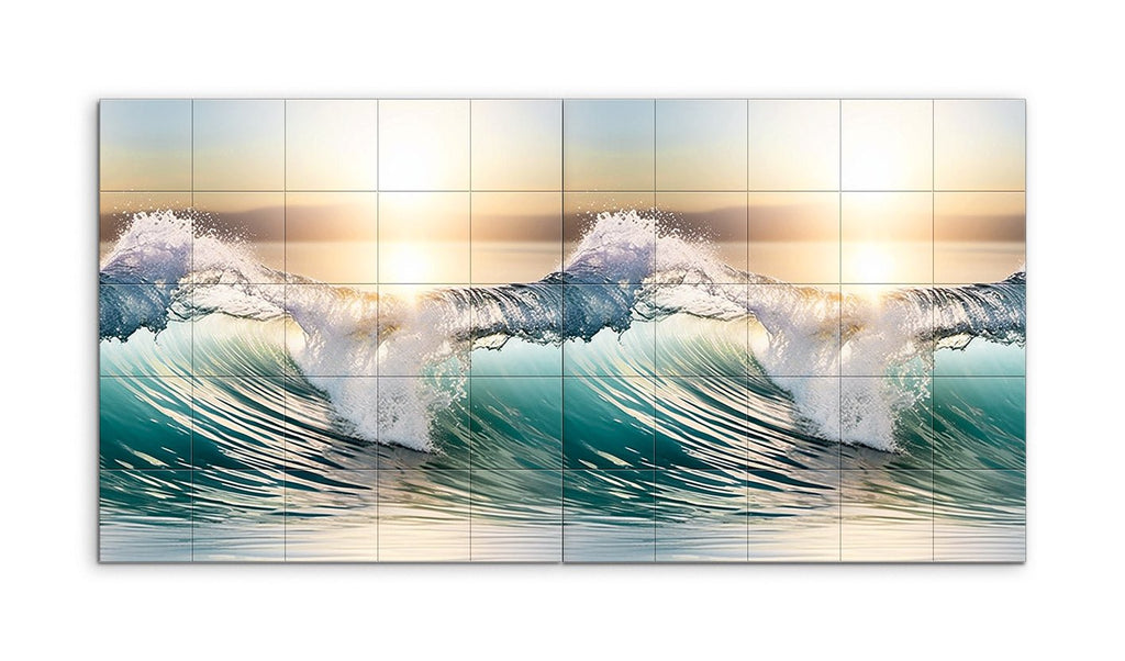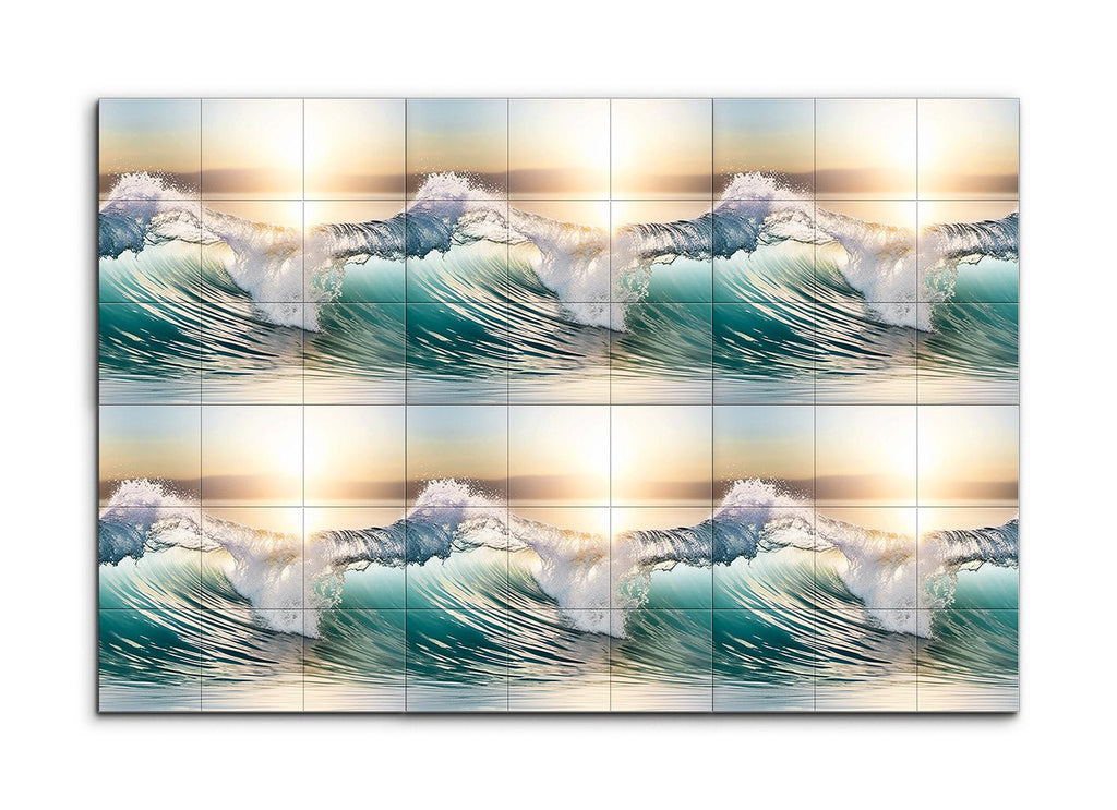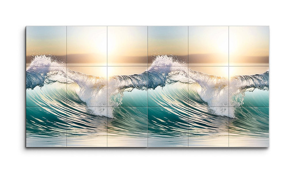 Immerse yourself in the captivating beauty of our tile mural, featuring a stunning seascape that captures a dynamic wave in mid-motion. The wave's intricate details and frothy crest contrast beautifully with the deeper turquoise hues, while sunlight filters through, casting a golden glow on the water. The softly blurred horizon with a rising or setting sun adds warm, radiant tones to the sky, blending cool blues with warm yellows and oranges. This photorealistic artwork evokes tranquility and natural beauty, making you feel as if you are witnessing the ocean's true essence firsthand.