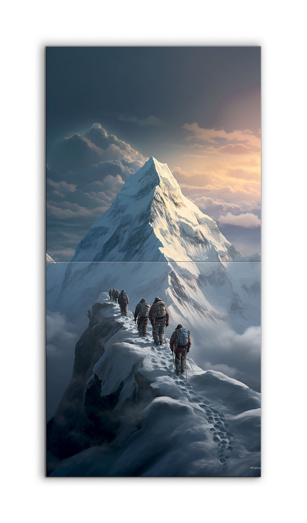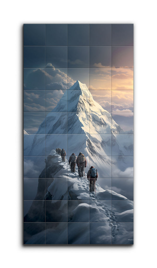 This tile mural portrays a breathtaking mountain scene featuring a towering, snow-covered peak illuminated by a warm, golden light. The dramatic contrast between the sunlit snow and the shadowed areas enhances the grandeur of the landscape. In the foreground, climbers in heavy winter gear navigate a narrow, snow-covered ridge, their footprints creating a path toward the majestic peak. The highly realistic style and meticulous details capture the serenity and formidable challenge of high-altitude mountaineering.