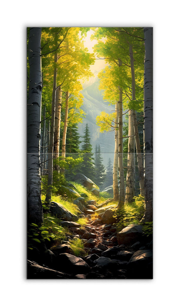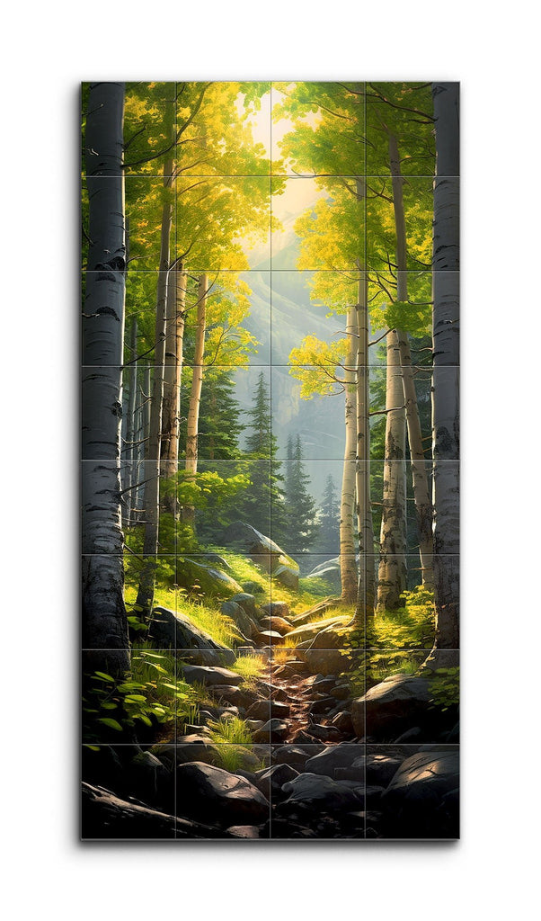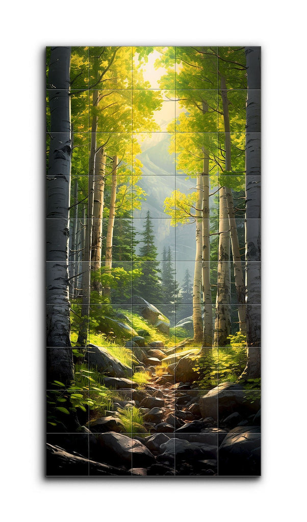 This tile mural showcases a serene forest scene bathed in soft, golden sunlight. Tall, slender trees with white bark and green leaves frame the foreground, their trunks stretching vertically. Sunlight illuminates the leaves, casting dappled shadows on the rocky path below. The path meanders through the forest, leading the eye to a distant, misty mountain. The realistic style with a touch of romanticism captures the beauty and tranquility of nature, using rich, vibrant colors and effective light and shadow play.