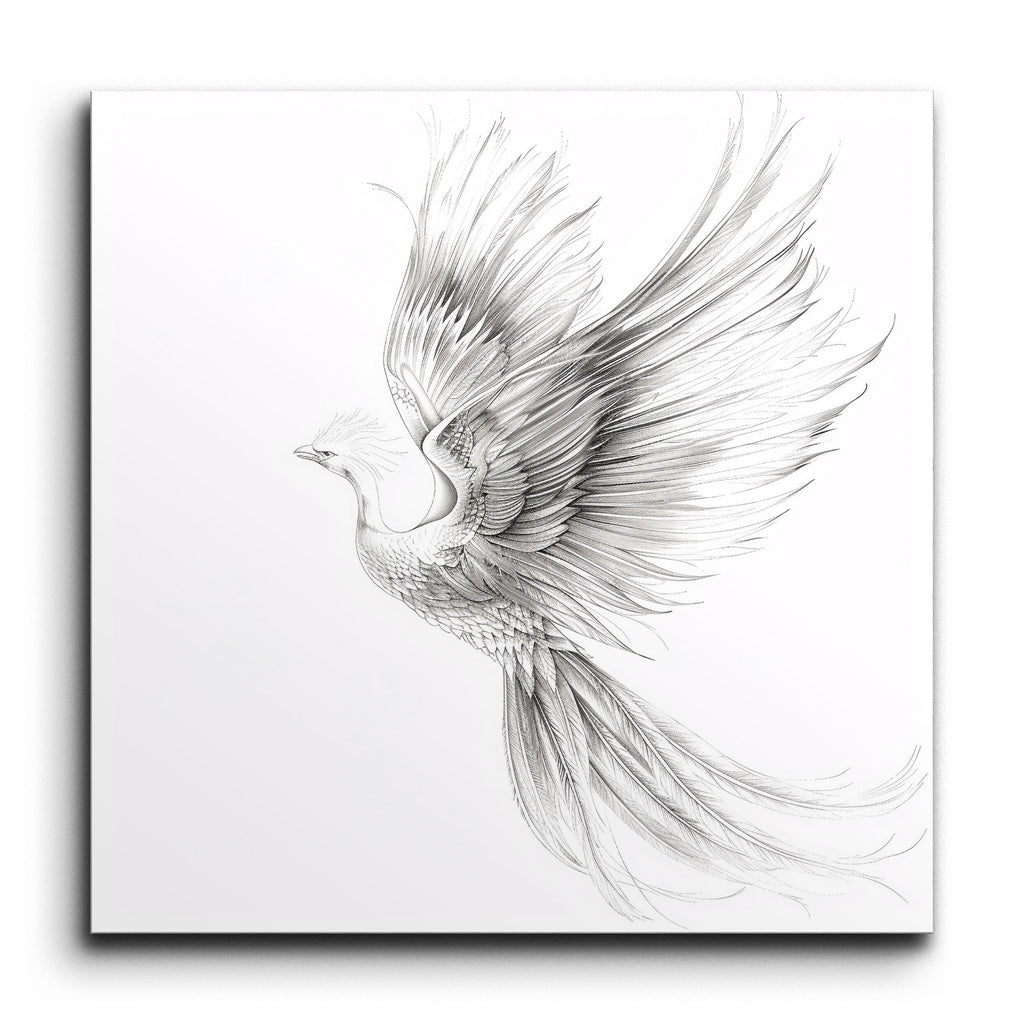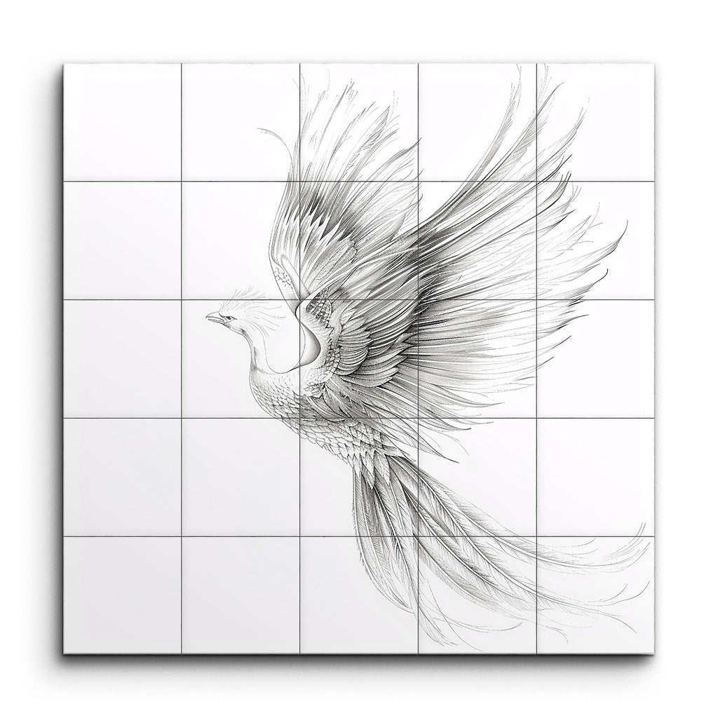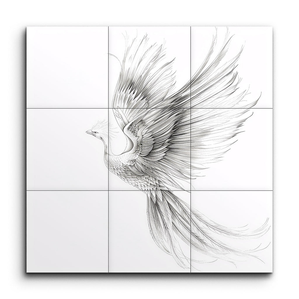Transform your space with this exquisite tile mural, featuring an elegant bird in flight. The artwork captures the bird's grace through meticulously detailed feathers, each varying in length and texture to convey movement. The minimalist design focuses on the bird's streamlined form and long, flowing tail, rendered in fine, delicate lines. The monochromatic color scheme highlights the refined intricacy of the line work, creating a sophisticated and serene visual experience.