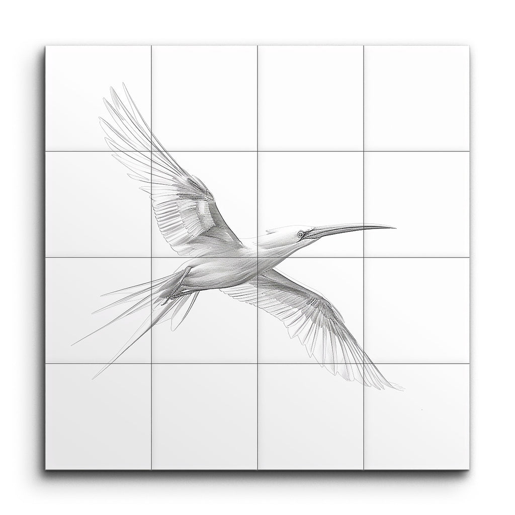 Elevate your space with this stunning tile mural that captures the elegance and grace of a bird in flight. The minimalist artwork features a bird with wings spread wide, showcasing intricate feather patterns rendered with fine, realistic lines. The sleek, elongated body and pointed beak suggest motion and fluidity, while subtle shading enhances the three-dimensionality without compromising the simplicity of the design. This mural brings a sense of lightness and refined beauty to any setting.