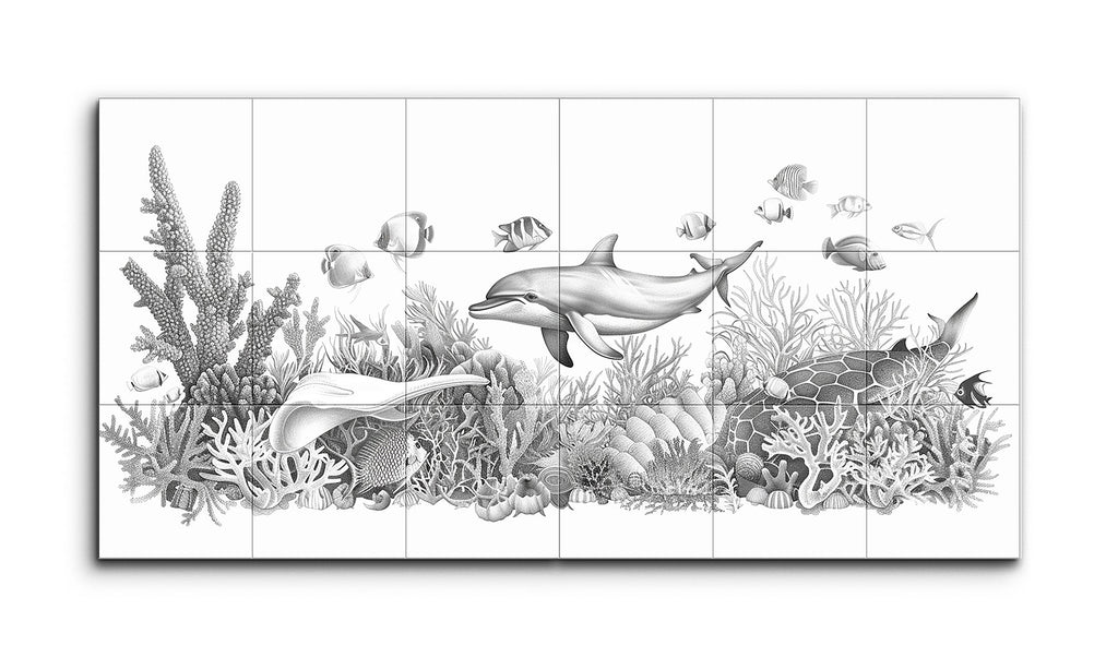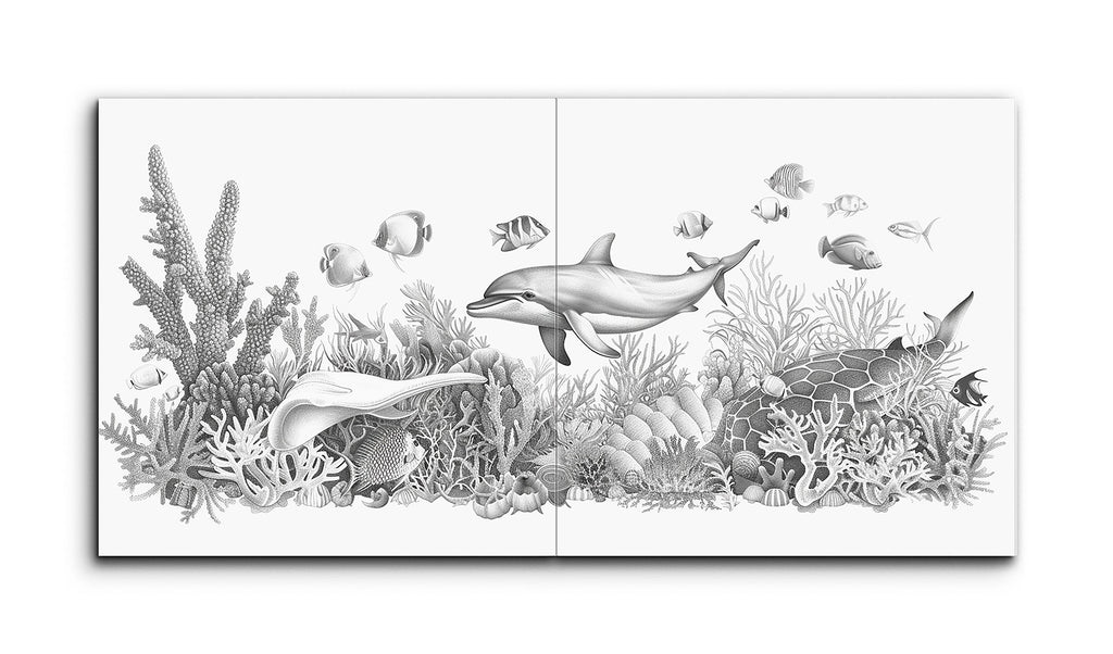 This monochromatic diptych captures a serene underwater scene in stunning grayscale. The left panel showcases intricate coral formations and small, striped fish, while the right continues the aquatic landscape with additional corals and marine life. Central to the composition are two gracefully arched dolphins, drawing the viewer's eye through the scene. A meticulously detailed sea turtle in the bottom right corner adds a dynamic element as it swims towards the surface. The realistic style emphasizes texture and linework, creating a captivating underwater tableau.
