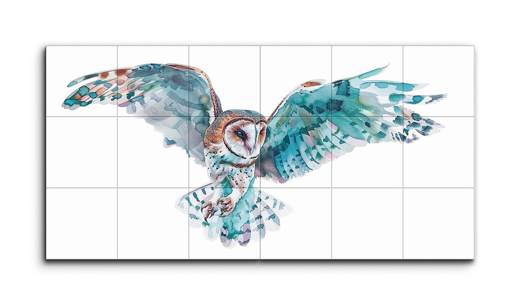 The artwork presents an owl in mid-flight, wings fully extended, rendered in a modern, somewhat abstract style. Dominated by cool blues and teals, with warm browns and oranges highlighting the owl's face and body, the image is composed of fragmented brushstrokes or digital strokes. This technique creates a fluid, dynamic sense of movement, as if capturing a swift moment in flight. Set against a minimalistic white background, the split across two panels adds a contemporary touch, emphasizing the owl's grace and natural beauty.