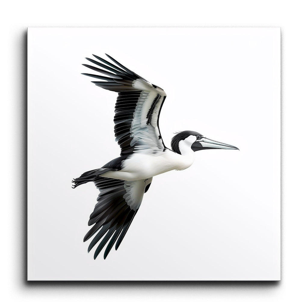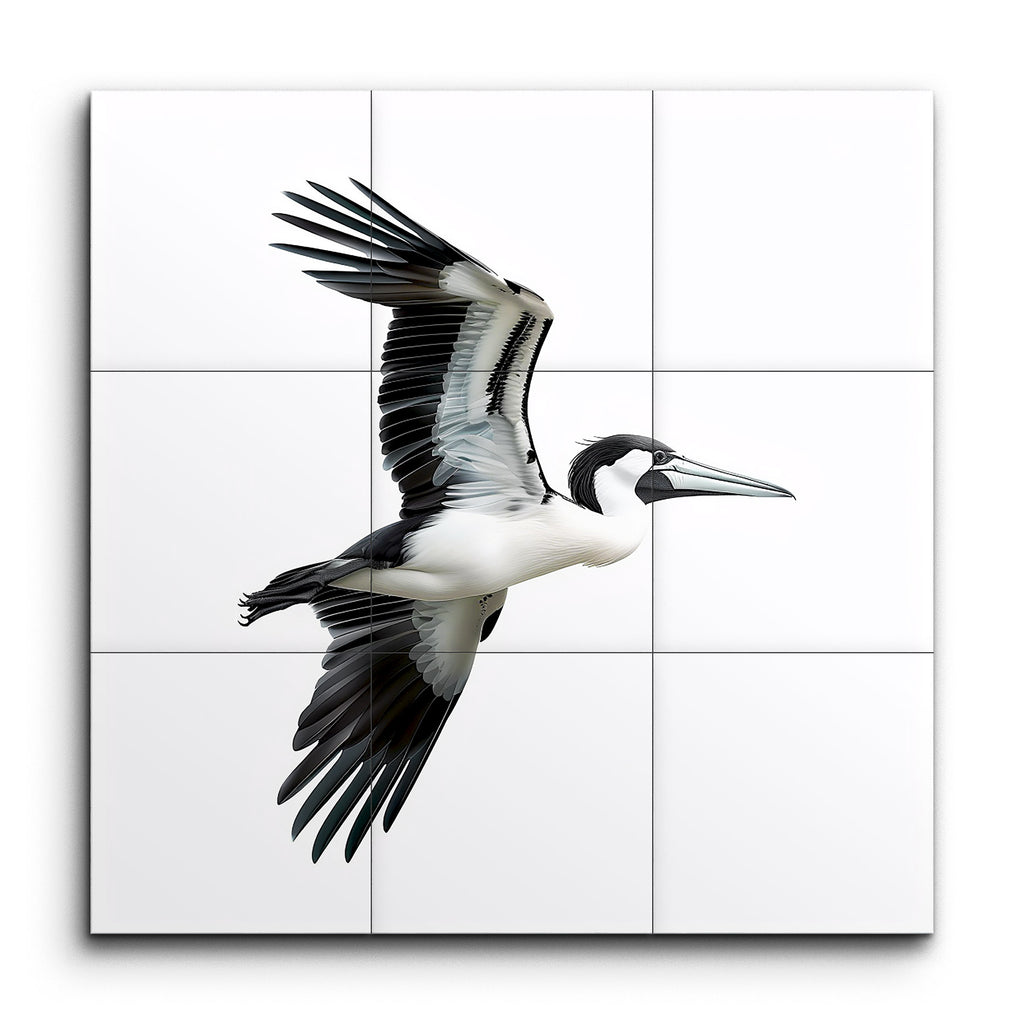 Experience the breathtaking elegance of nature with this stunning tile mural, featuring a hyperrealistic depiction of a bird in flight. Captured mid-air, the crane or heron extends its wings gracefully, showcasing meticulously rendered feathers that transition from black to white. The sleek, elongated body, long neck, and pointed beak embody the lifelike essence of wading birds. Dynamic and full of movement, this artwork brings the bird's majestic grace to life, making it a captivating centerpiece.