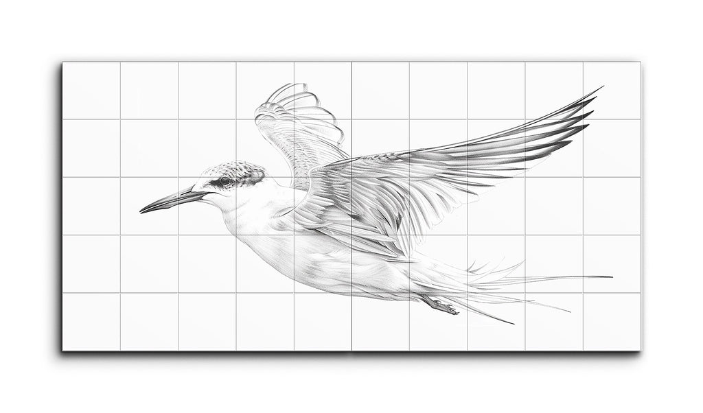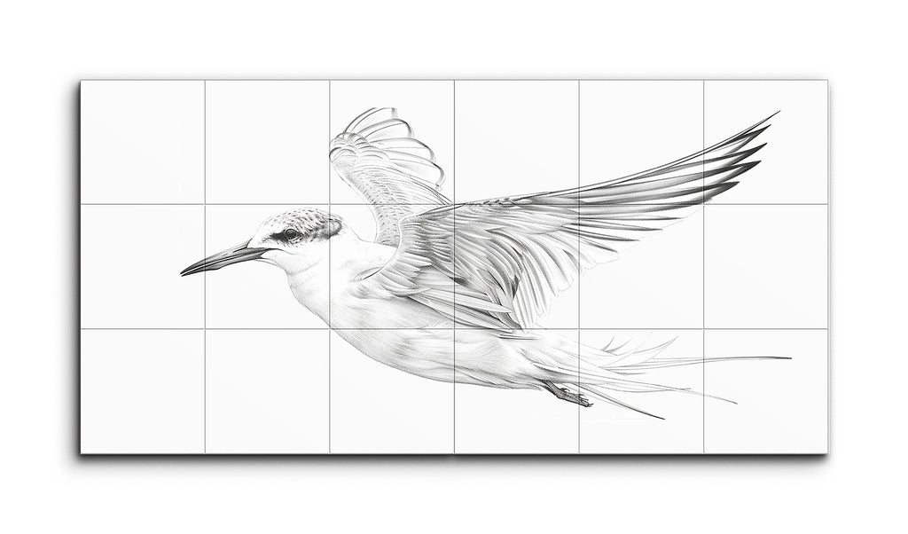This tile mural showcases a bird in mid-flight, spread across two panels forming a cohesive image. Rendered in grayscale, the artwork emphasizes realism with intricately detailed feathers and a focus on avian anatomy. The bird's expansive wingspan, slender body, and long tail feathers are captured in a moment of graceful motion. Positioned diagonally, the composition leads the viewer's eye, conveying freedom and the elegance of flight. The bird's eye, turned towards the viewer, adds a sense of life and alertness.