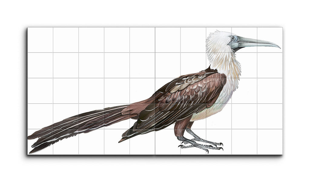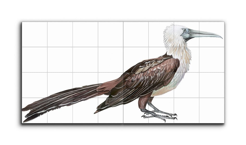 The artwork showcases a frigatebird in profile, highlighting its long wingspan and forked tail. Rendered in a realistic style, the bird's feathers are meticulously detailed in shades of brown with glossy highlights, contrasting with its white head plumage. The sturdy, hooked beak and alert eye are striking, while the folded wings and extended tail feathers create a graceful silhouette. The detailed legs and claws underscore the bird's natural adaptations. A plain background ensures the bird remains the focal point, emphasizing its intricate features.