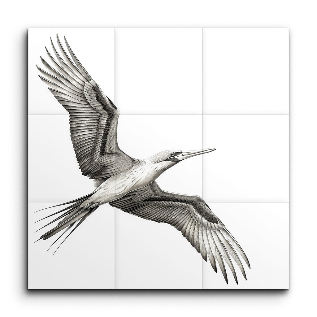 Experience the captivating beauty of nature with this stunning tile mural, featuring a bird in mid-flight. The artwork's monochromatic palette of black, white, and gray accentuates the intricate patterns and textures of the bird's feathers. With wings fully extended and a streamlined body, the bird is depicted in a highly realistic style, showcasing its grace and elegance. The meticulous detail and masterful use of light and shadow create a lifelike, three-dimensional effect that brings this dynamic scene to life.