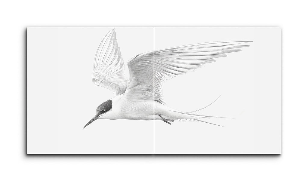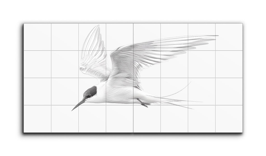 This tile mural features a detailed and elegant illustration of a tern in mid-flight. The bird's slender body, long wings, and forked tail are meticulously rendered, showcasing intricate feather details that convey texture and movement. The tern's head, with its black cap and sharp beak, is slightly turned. The minimalist, monochromatic style emphasizes delicate line work and subtle shading, enhancing the bird's grace and elegance. The use of negative space highlights the bird's prominence, evoking a sense of freedom and lightness.