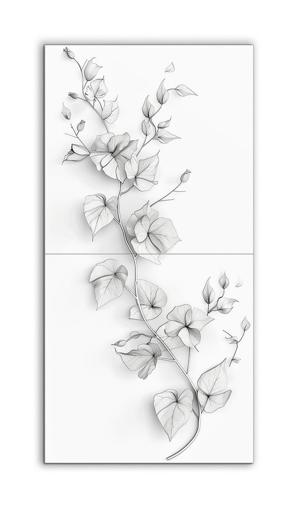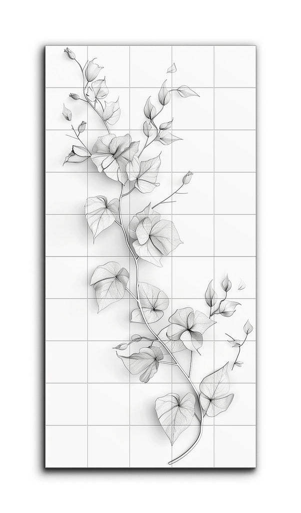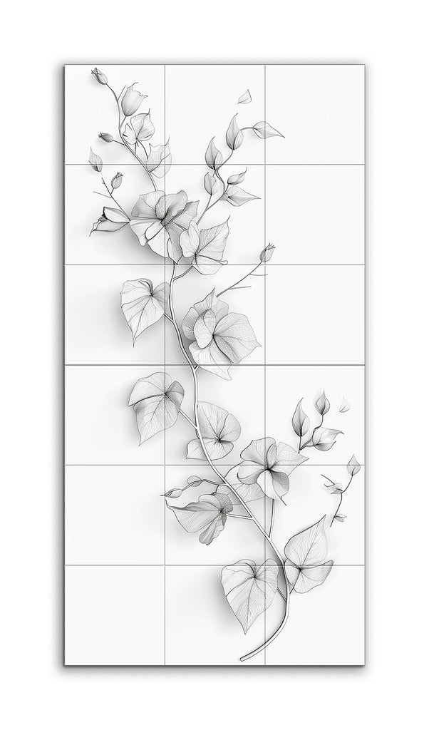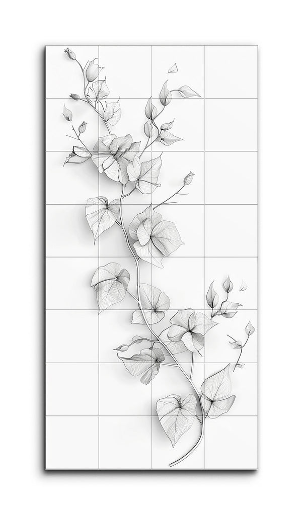 This tile mural showcases a delicate botanical illustration of a flowering vine, rendered in a minimalist, monochromatic style. Fine lines and subtle shading create a sense of depth as the vine meanders gracefully from bottom to top. Intricately detailed leaves and flowers, depicted in various stages of bloom, add a dynamic element. The use of negative space accentuates the elegant and refined natural beauty, highlighting the intricate details and lifelike quality of the plant.