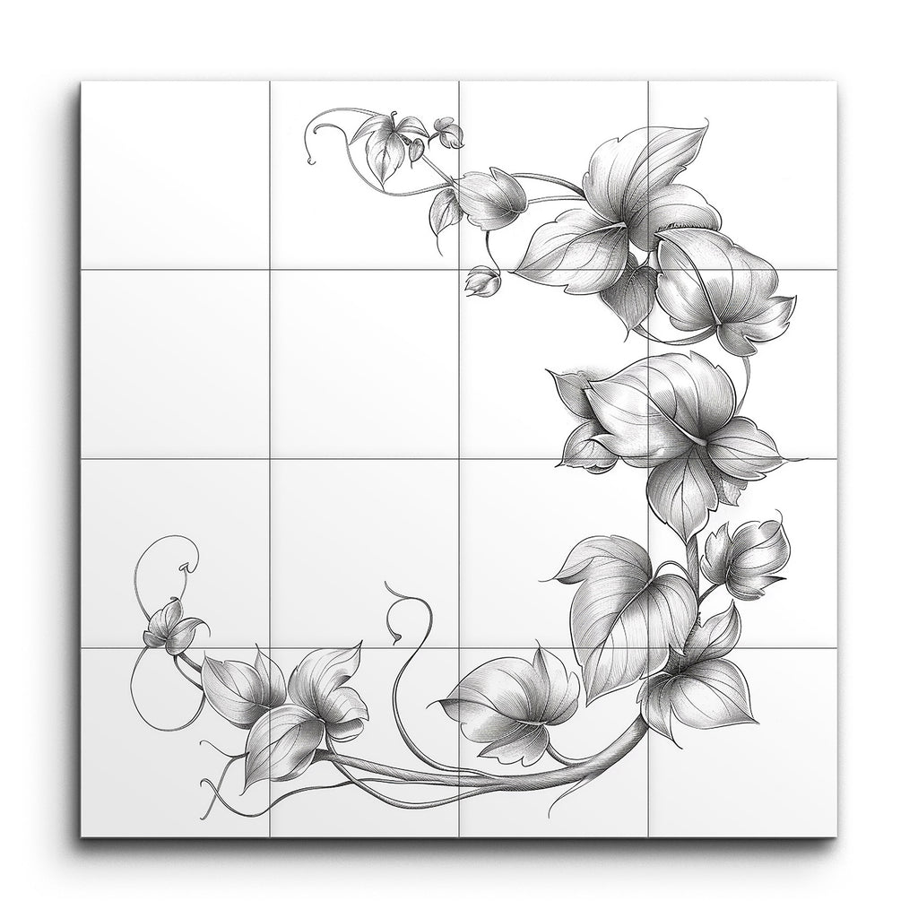 Transform your space with this exquisite tile mural, featuring an intricate drawing of flowers and vines. Each petal and leaf is meticulously shaded to evoke depth and texture, while the twisting vines add a sense of graceful movement. The elegant and refined style, highlighted by fine lines and subtle shading, captures the natural beauty of botanical elements. The monochromatic color scheme enhances the sophistication, emphasizing the artwork's intricate details and masterful line work.