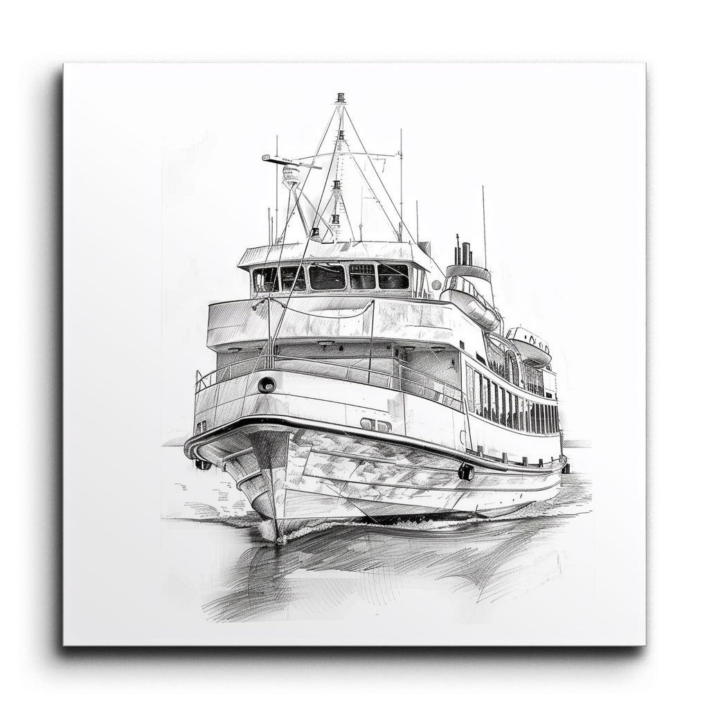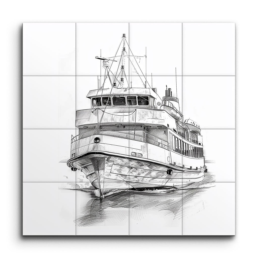 Transform your space with this captivating tile mural, featuring a meticulously detailed black and white sketch of a grand passenger ship. The artwork captures the vessel from an intriguing front-right angle, showcasing the bow and starboard side with precision. Every element, from the railings to the bridge, is rendered with fine lines and expert shading. The realistic depiction of the ship’s structure and the gentle waves below create a dynamic and technically impressive visual experience.