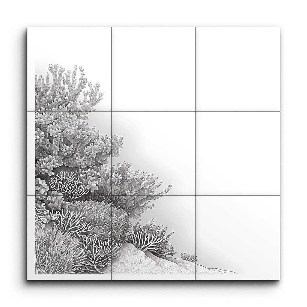 Immerse yourself in the intricate beauty of the deep sea with our monochromatic grayscale tile mural, depicting a mesmerizing underwater coral reef scene. This artwork captures the rich diversity of marine life with meticulous attention to detail, showcasing various corals and marine flora in stunning three-dimensional depth. Inspired by paper cutting techniques, each element appears delicately carved, creating a timeless and elegant piece that brings the serene complexity of the ocean to any space.