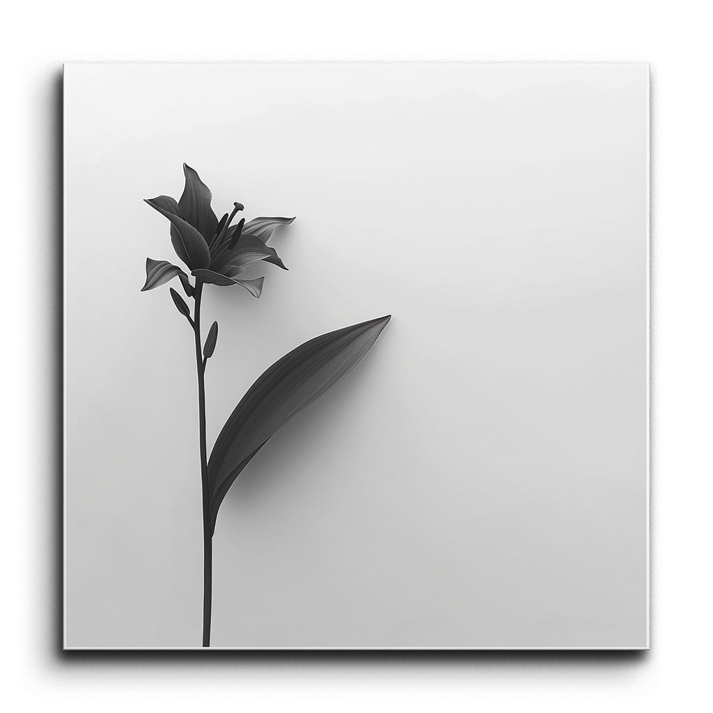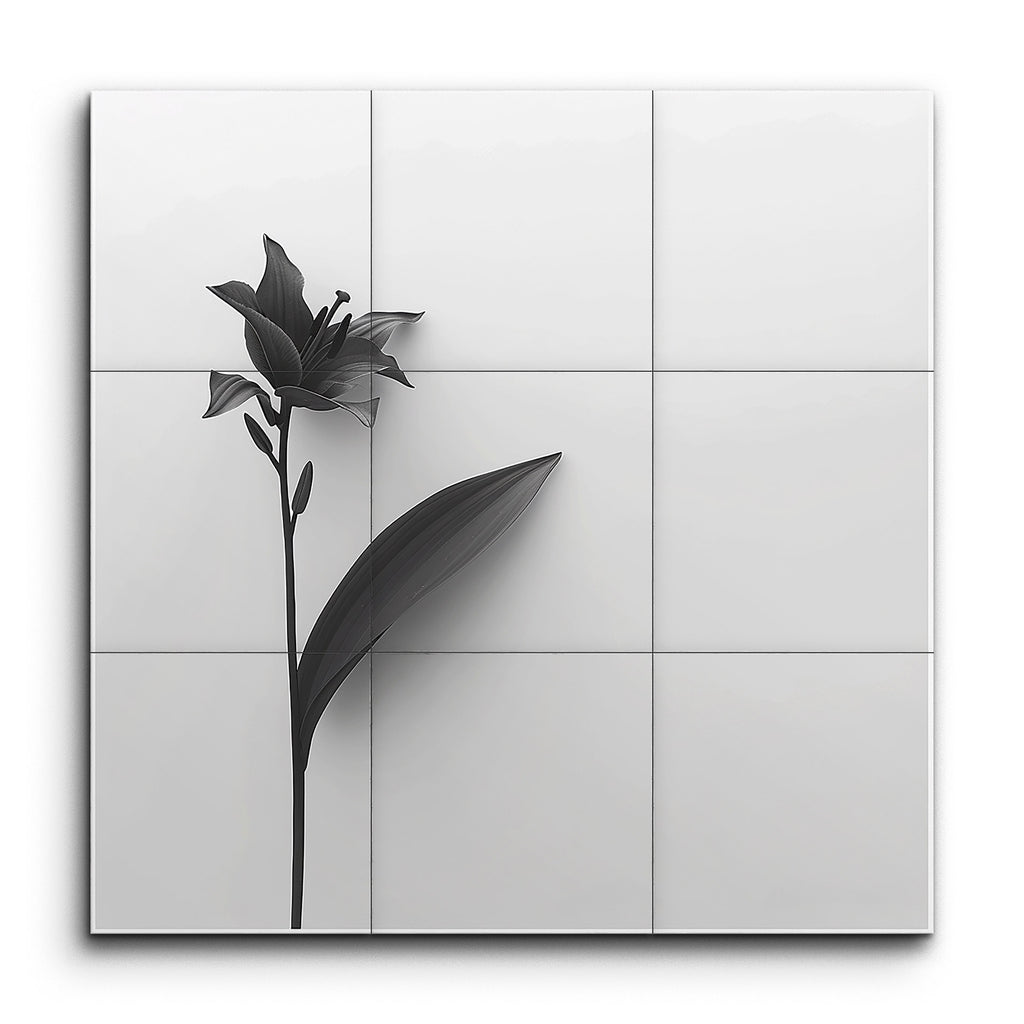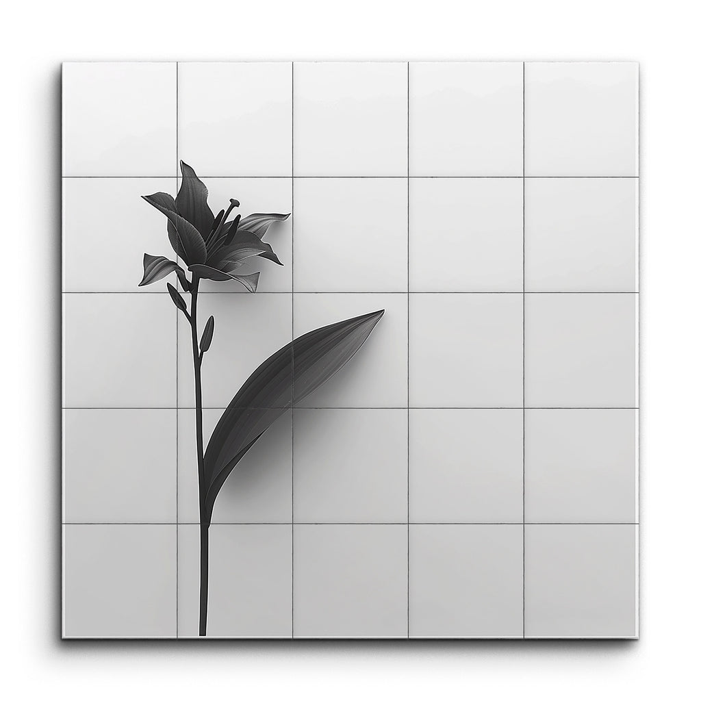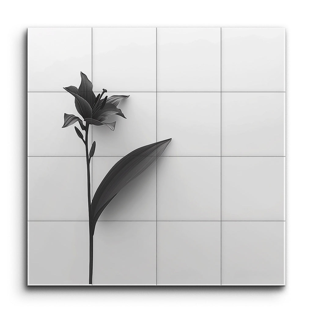 Elevate your space with this minimalist tile mural, featuring a grayscale depiction of a lily. The off-center positioning and gentle lean of the flower create a dynamic yet serene composition. Delicate petals, a slender stem, and gracefully curved leaves contribute to its elegant simplicity. The detailed portrayal of the stamen and pistil enhances its lifelike quality. Clean lines and subtle shadows bring depth and sophistication, making this piece a timeless addition to any setting.