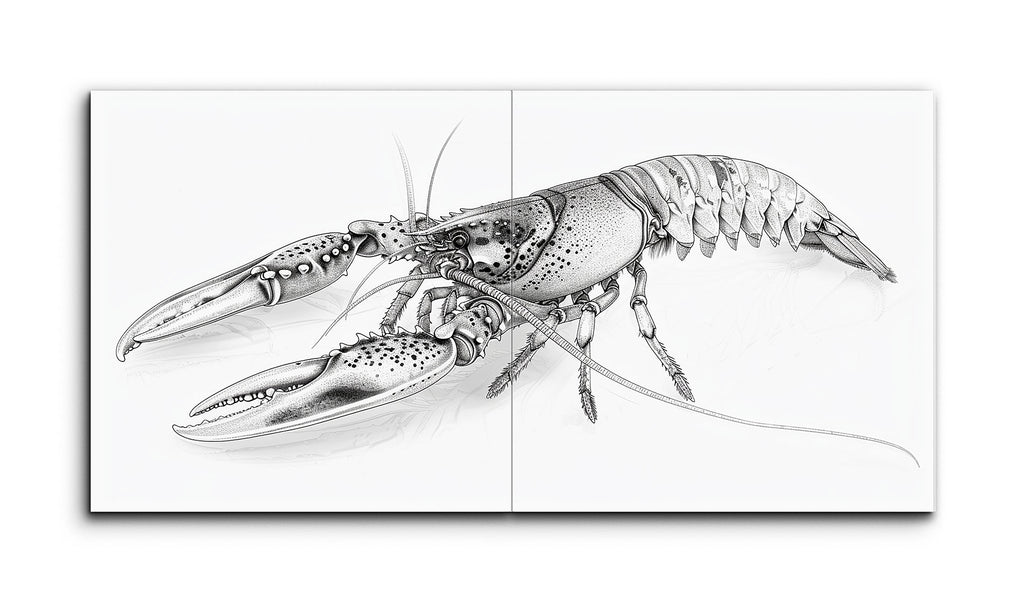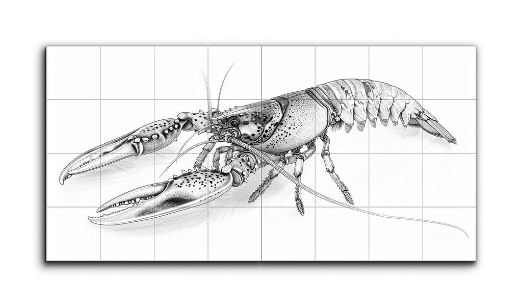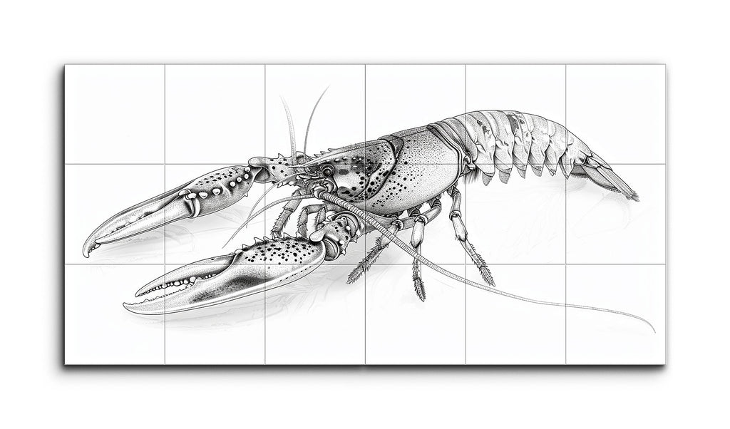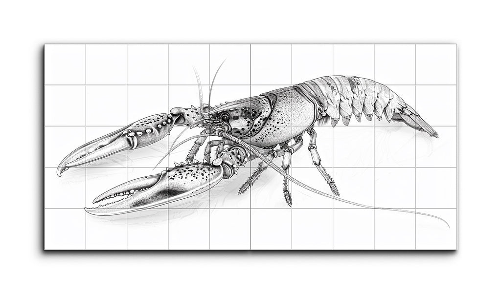 This tile mural showcases a meticulously detailed illustration of a lobster in a grayscale palette. The lobster's body is centered, with its claws extending dynamically across the surface, creating a sense of movement. The artwork, reminiscent of traditional biological illustrations, highlights the intricate segmentation of the exoskeleton and the delicate articulation of joints. The fine line work and stippling techniques give the lobster a three-dimensional appearance, blending aesthetic appeal with educational precision.