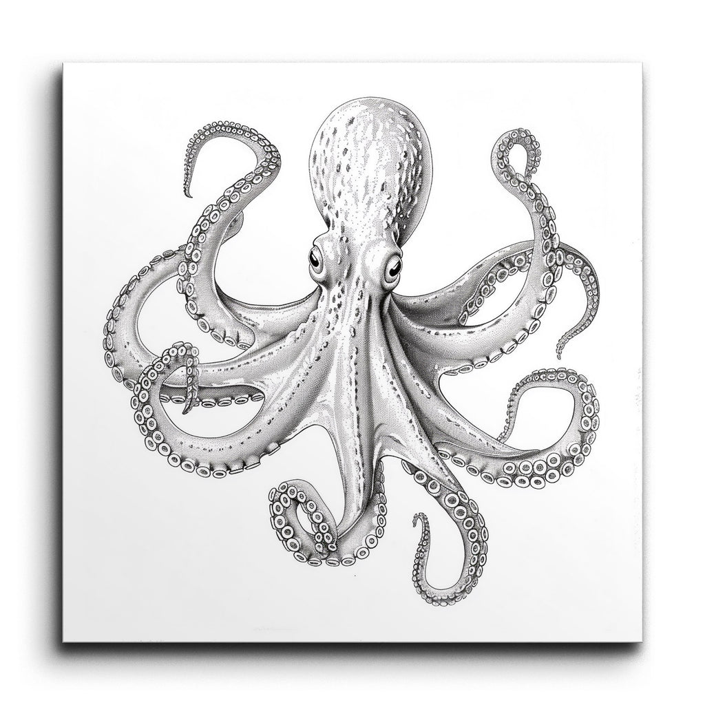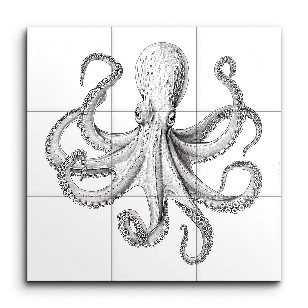 Immerse your space in the mesmerizing beauty of the deep sea with our tile mural featuring a detailed and realistic grayscale illustration of an octopus. Each tentacle twists and curls with dynamic fluidity, showcasing meticulous attention to texture and form. The lifelike eyes glisten, adding a captivating touch to this three-dimensional masterpiece. Perfect for adding a touch of nature's intricate elegance to any room, this mural beautifully captures the complexity and natural beauty of the octopus.
