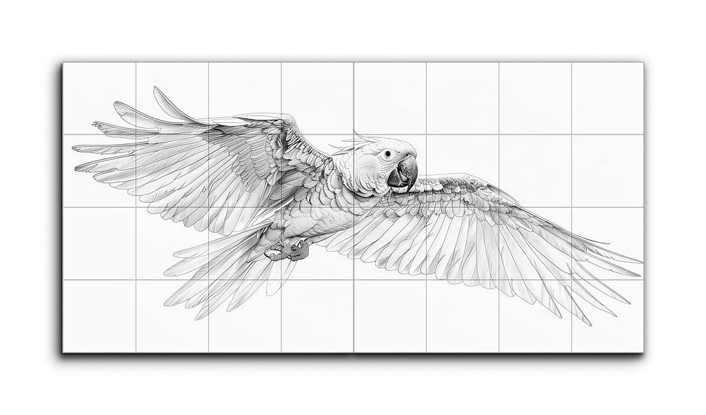 This tile mural showcases a meticulously detailed drawing of a parrot in mid-flight, spread across two adjoining canvases. Rendered entirely in grayscale, the artwork emphasizes the parrot's dynamic motion with fully extended wings and splayed feathers. Each feather is intricately detailed, highlighting various textures and patterns. The play of light and shadow adds a three-dimensional quality, while the parrot's intense expression and diagonal positioning across the canvases create a sense of movement and energy.
