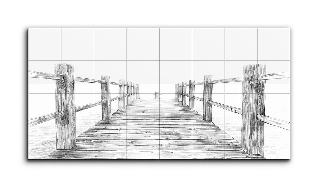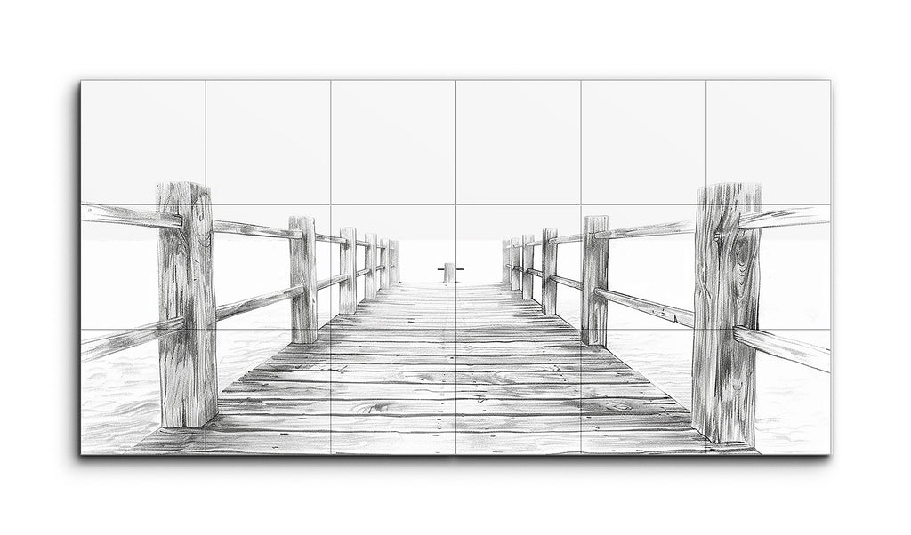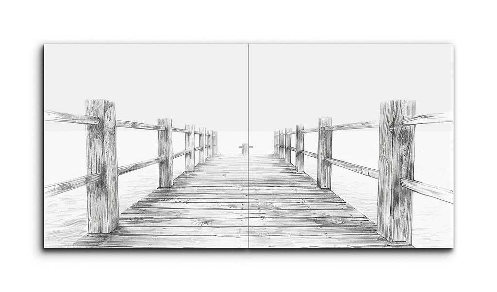 This two-panel mural captures a serene wooden pier stretching out into a body of water, rendered in grayscale. The realistic style highlights intricate details of the wooden planks and posts, with a strong light source creating dramatic shadows and highlights. A small figure or object at the horizon adds intrigue. The central, linear perspective draws the eye into the scene, evoking solitude and introspection. The split panels invite the viewer to journey through the artwork, mirroring the pier's depth and symmetry.