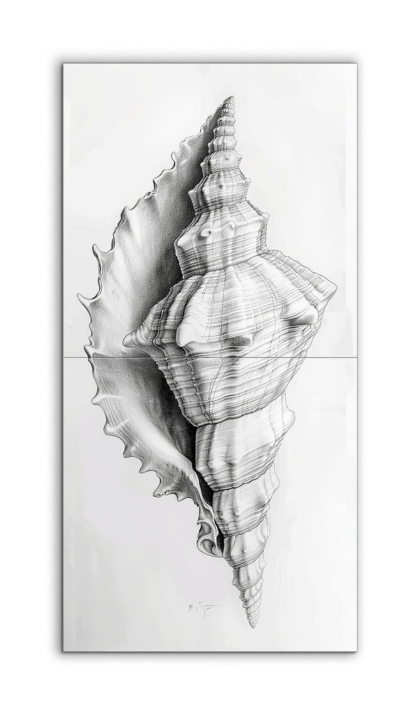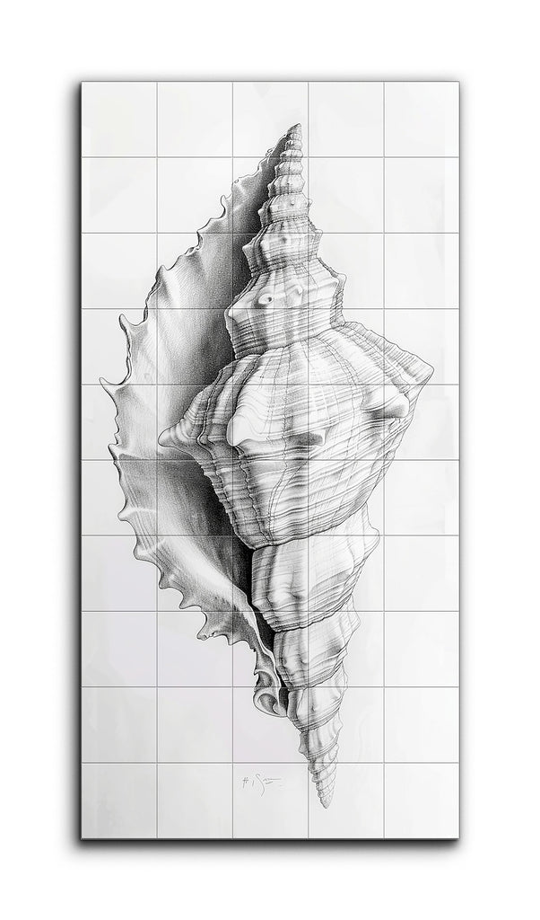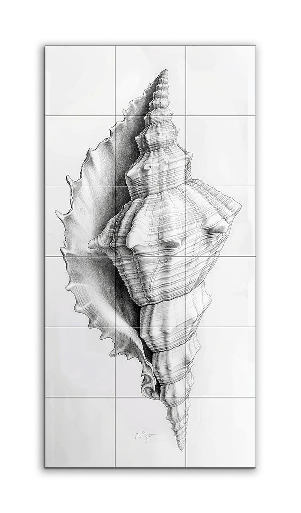 This tile mural features a hyper-realistic drawing of a seashell, meticulously rendered in grayscale. The artwork highlights the intricate textures and patterns of the shell's surface, with precise shading that creates a three-dimensional effect. The clean, minimalistic composition focuses on the natural beauty and complexity of the shell's form, while the grayscale palette adds a timeless elegance, allowing the detailed craftsmanship to stand out without distraction.
