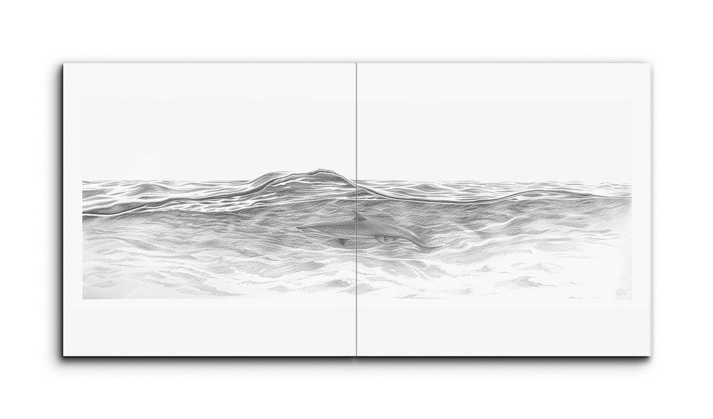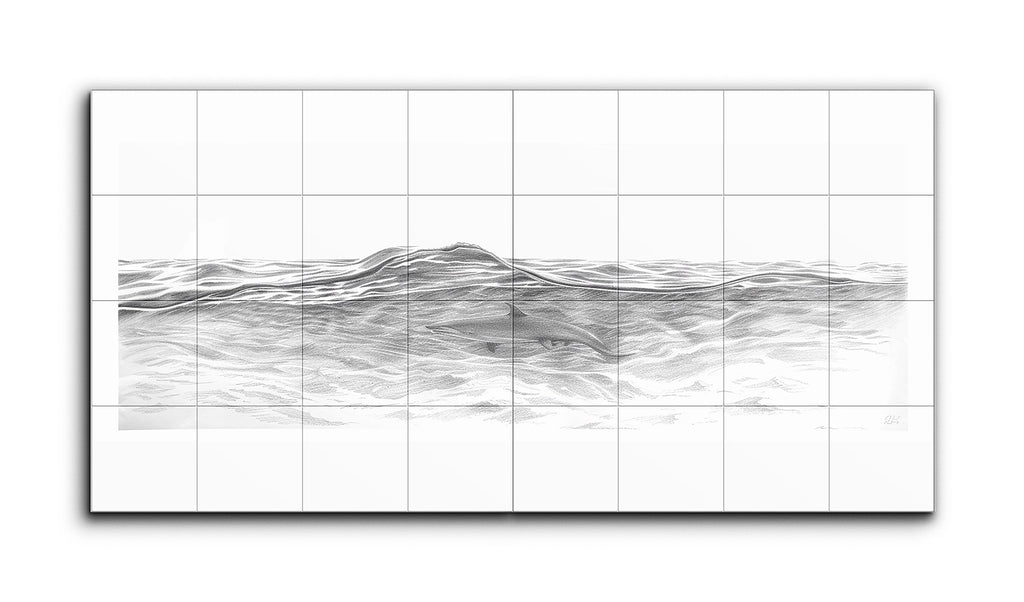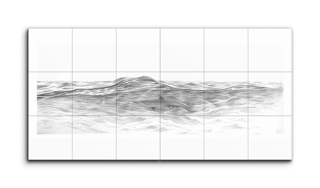 This diptych tile mural features an abstract depiction of a body of water in grayscale tones. The minimalist and modern style emphasizes linearity and fluidity, with waves rendered through varying lines and strokes to create movement and rhythm. Concentrated lines at the wave crests suggest light and shadow, while sparse lines in the troughs convey calmness and depth. The grayscale palette enhances the abstract form and movement, with the central gap between the panels introducing a contemplative duality.